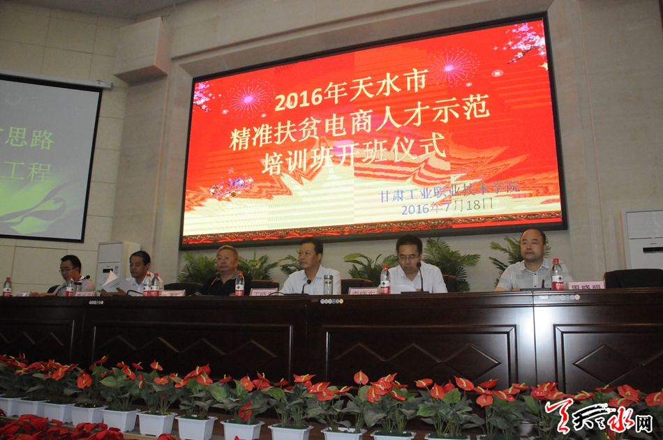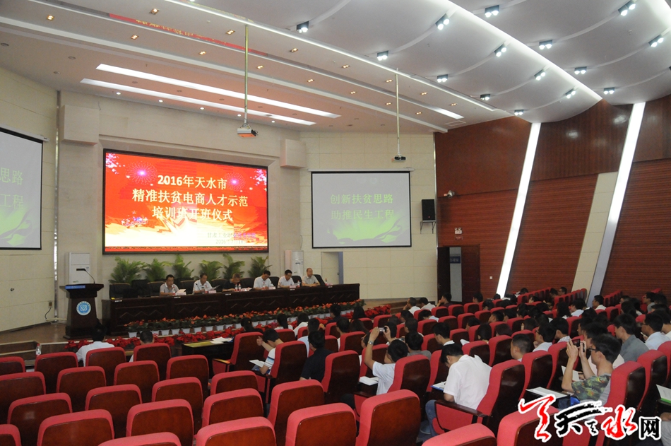 天天天水网18日12时讯【记者甄娜】7月18日上午,2016年天水市精准扶贫电商人才示范培训班开班仪式在甘肃工业职业技术学院新图书馆5楼报告厅隆重开幕,来自天水市各区县的大学生村官和驻村干部共100人参加此次培训。接下来,培训班将开展为期五天的集中培训。