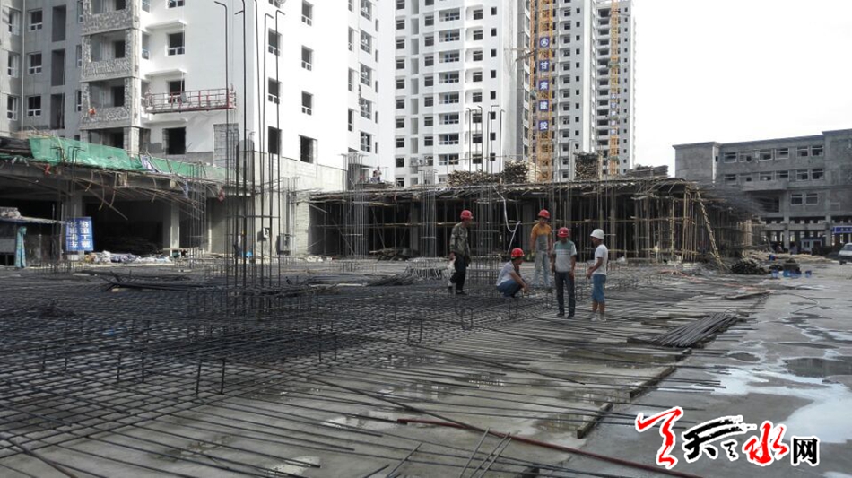天天天水网19日17时讯 【记者 姬旺芳】7月19日,工人正在公园佳园紧张作业。位于麦积区马跑泉镇,概算总投资10亿元的公园佳园,作为我市重大的城建棚改项目,目前该项目主体工程已基本封顶,正在进行内外墙粉刷、门窗安装等工作,预计2016年底完成一期工程建设任务。