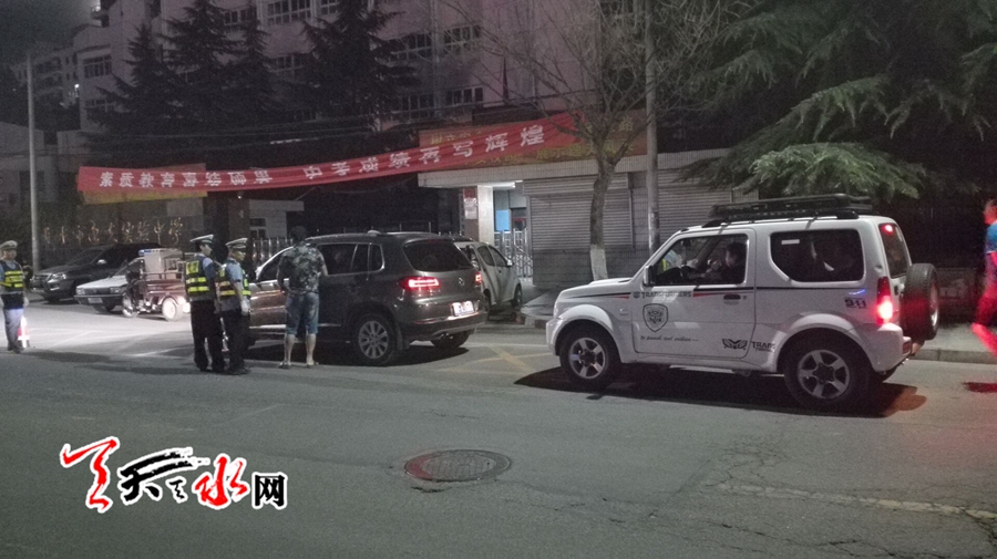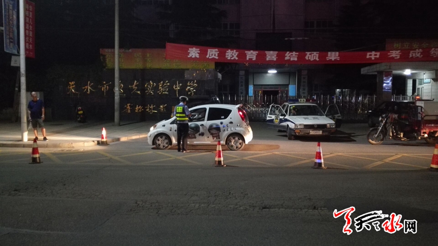 天天天水网20日22时讯(记者苏中豹)20晚间,在位于秦州区天水湖畔逸夫中学门前,交警正夜查车辆。