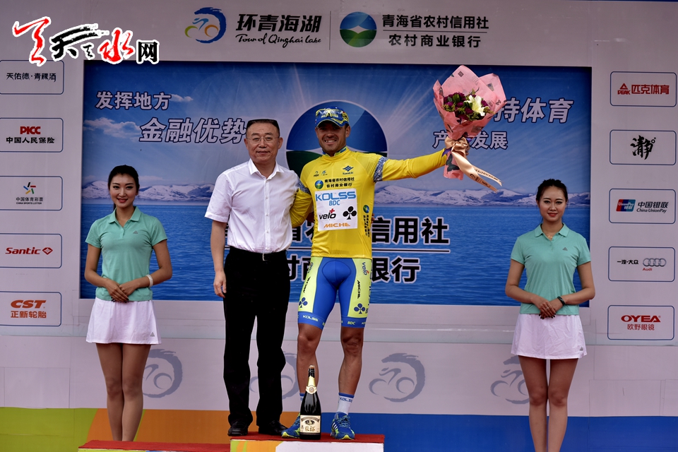 王锐为个人总成绩领先者——乌克兰科尔斯车队的维塔利·布茨颁发黄衫。
