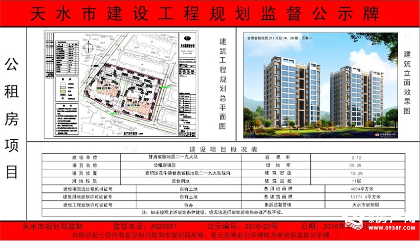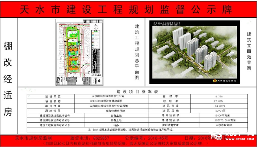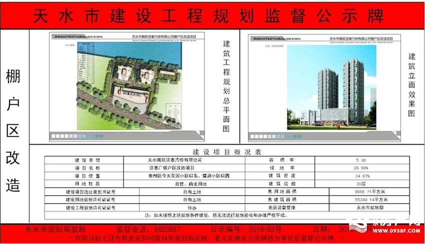 活塞厂棚户区改造项目位于天水腾跃活塞厂家属区,范围东至盛源小区、西至今天花园小区、北至罗峪河护堤、南至泰山路。从公示的信息可见,该项目总用地面积8686.71㎡,总建筑面积约5.5万平方米,将建设两栋层高为30层的单体建筑。小区容积率为5.36、绿地率为26.98%、建筑密度为34.67%。规划公示牌如下: