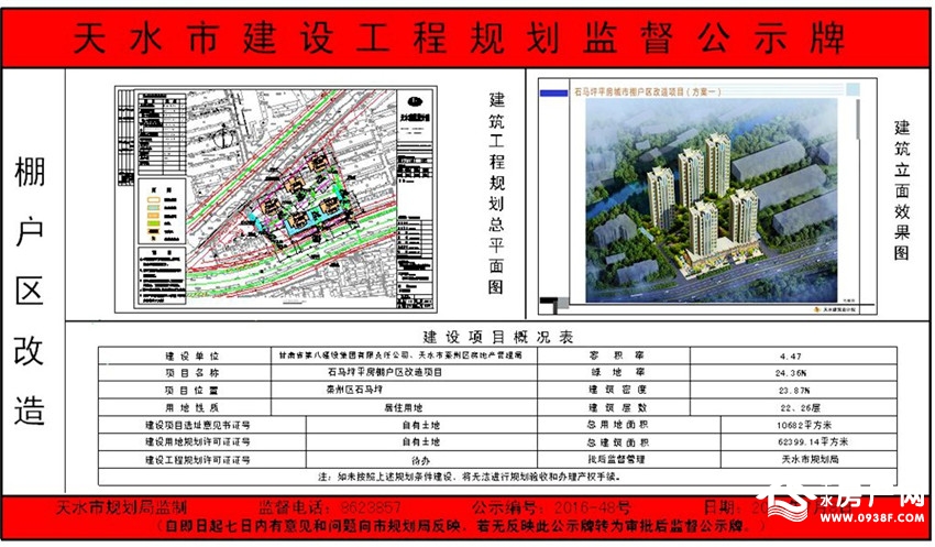 石马坪平房棚户区改造项目,位于秦州区石马坪,项目总建筑面积62399.14平方米,总用地面积10682平方米。从规划公示的信息可见,整体项目由5栋层高为22-26层的单体建筑构成,小区容积率为4.47,绿地率24.36%,建筑密度23.87%。该项目的建设单位为甘肃省第八建设集团有限责任公司、天水市秦州区房地产管理局,土地性质为居住用地。规划公示牌如下: