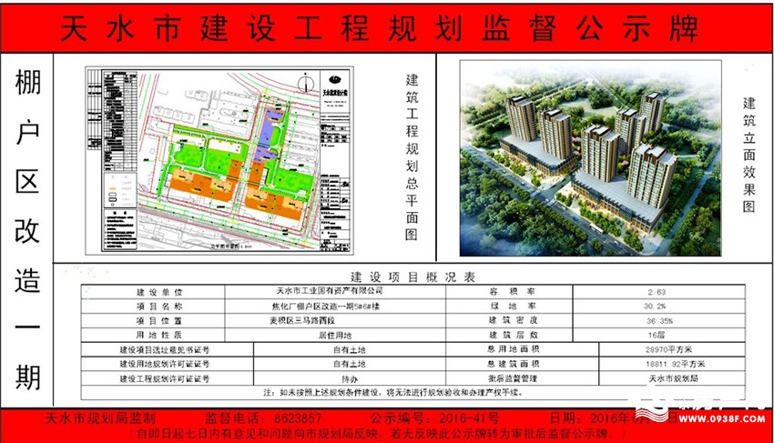 焦化厂棚户区改造一期5#6#楼,位于麦积区三马路西端,项目总建筑面积18811.92平方米,总用地面积28970平方米。从规划公示的信息可见,整体项目由6栋层高为16层的单体建筑构成,小区容积率为2.63,绿地率30.2%,建筑密度36.35%。该项目的建设单位为天水市工业国有资产有限公司,用地性质为自由土地的居住用地.