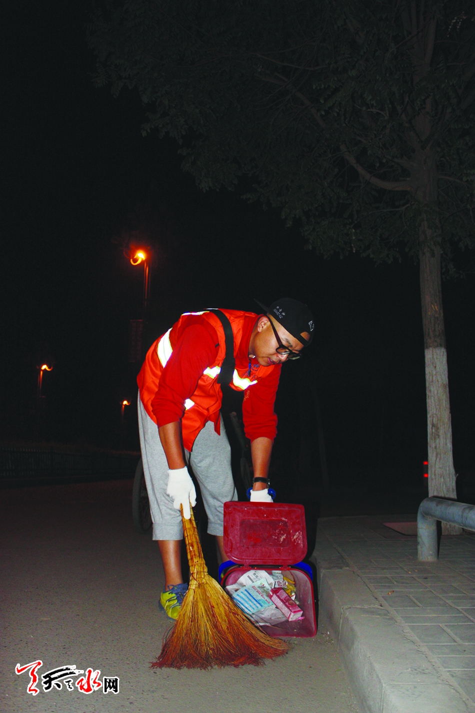 周师傅告诉我,凌晨的这次清扫叫做大扫,要乘街上没人没车的时候把路面上的落叶、乘凉人留下的垃圾等全部清扫干净。因为我从来没有干过这样的活,为了照顾我,周师傅决定自己用大扫把清扫路面,让我负责推着垃圾车跟在后面,把他扫成堆的垃圾扫进簸箕,倒在手推车里面。按照周师傅的安排,我们一老一少便开始了今天的工作,从莲亭向天水师院南校区一路清扫了过去。