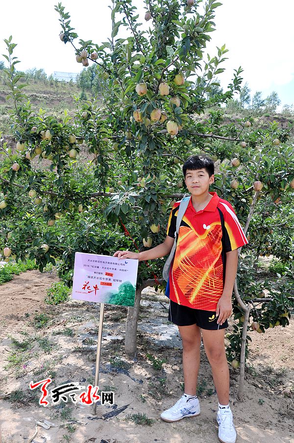 天水市晶星乒乓球俱乐部的孟繁硕站在以他名字命名的花牛苹果树前,一脸的灿烂与自豪。“这棵苹果树见证我的荣誉,伴我成长,与我同行。不管风吹雨打,我都会铭记这一时刻,在乒乓球的路上勇往直前。”