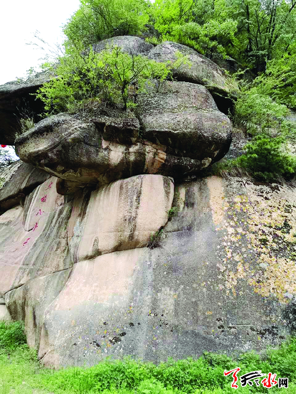 这个景点位于五龙山山脚下,有一高20米、宽13米的巨石突悬,巨石下刻有“太极八卦石”几个大字。据考证,这是开凿于北魏的佛爷崖,石造佛像已被毁坏,现窟顶仅遗存明代壁画太极八卦图,约10平方米,色泽绚丽、耀眼夺目,故又名八卦崖。八卦崖年代久远,壁画的颜色集佛、道合一,具有很高的考古价值。看了崖旁上的文字介绍我们得知,因该壁画画面抽象,所绘图案的意义至今无人破解。在“太极八卦石”下方,有一条小溪,虽然水流潺潺,但由于游人的逐年增多,溪水内飘满了各种垃圾,早已没有了往日的清澈。佛爷崖的崖顶长满了树木,形成一片阴凉。崖下绿油油的草地恰好和这一片片绿荫遥相呼应。佛爷崖周围鲜有平坦的道路,通往深处的路面上都是一块块巨石,这些巨石从哪里来已无从考究,可能是当初雕刻时留下的吧!