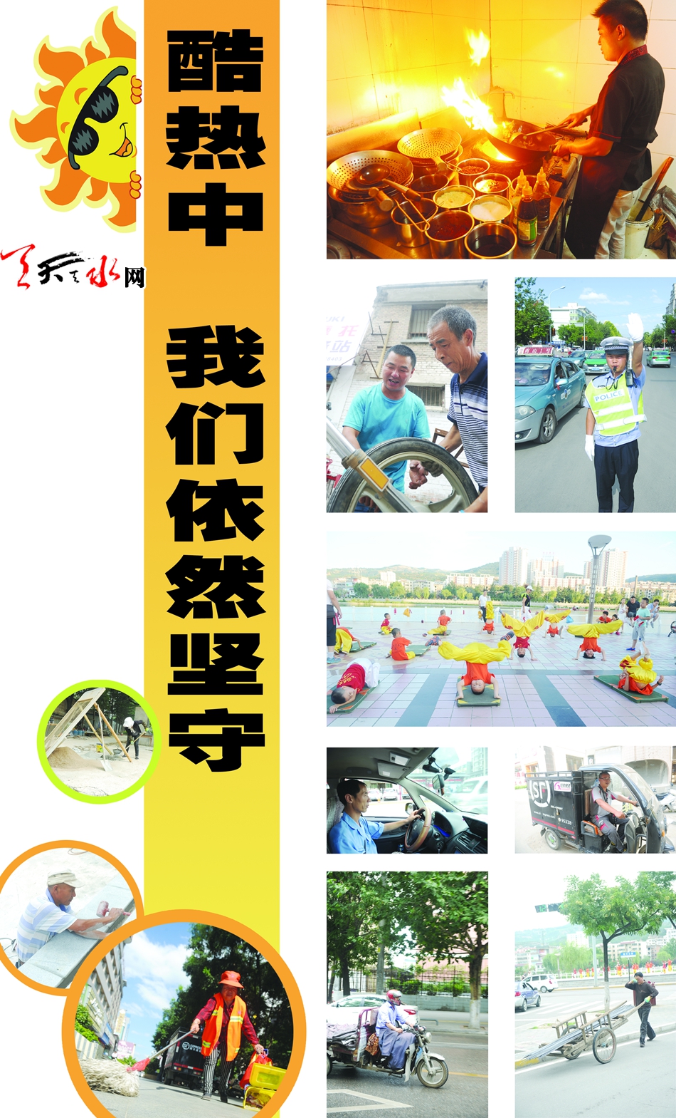 这几天,记者听到的最多的一句话就是“热死了”,是啊,天是真热啊!然而,有那么一群人,即使天气再热也不能躲在房子里或树荫下乘凉。这群人中有建筑工人、有检修电路的电工、有环卫工人、有快递投送员、有送水工、有执勤交警、有厨师……