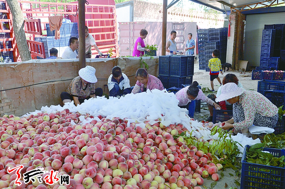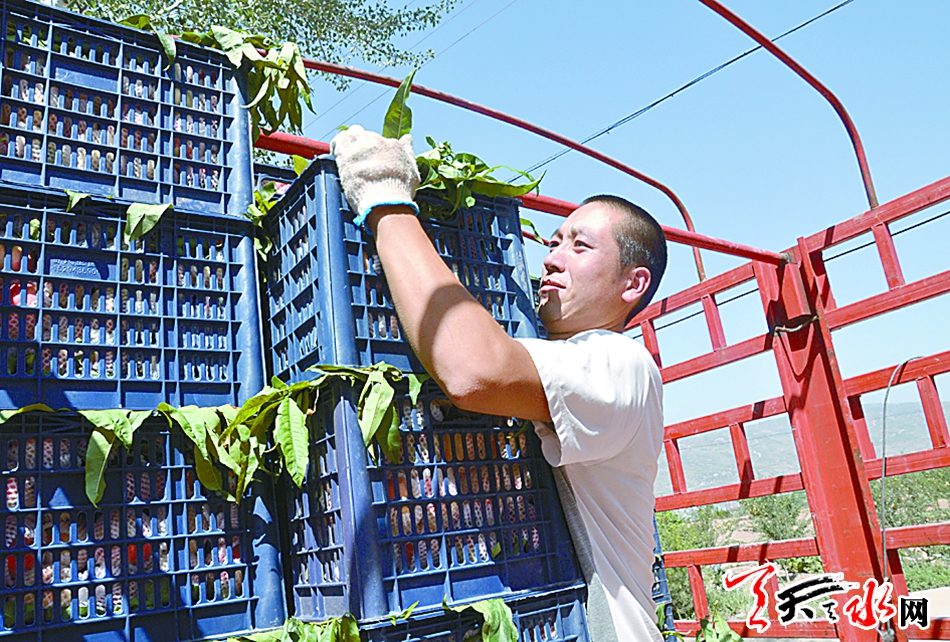 记者在秦安县城的果蔬批发市场内看到,一辆辆满载蜜桃的三轮车驶入市场,一筐筐过秤、装箱,远销他乡。