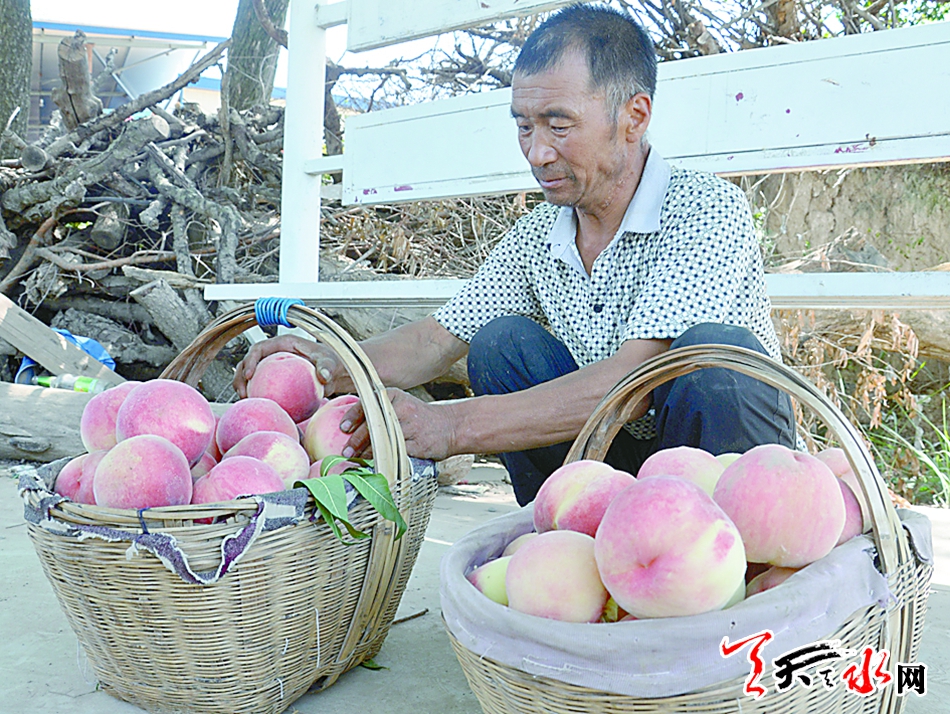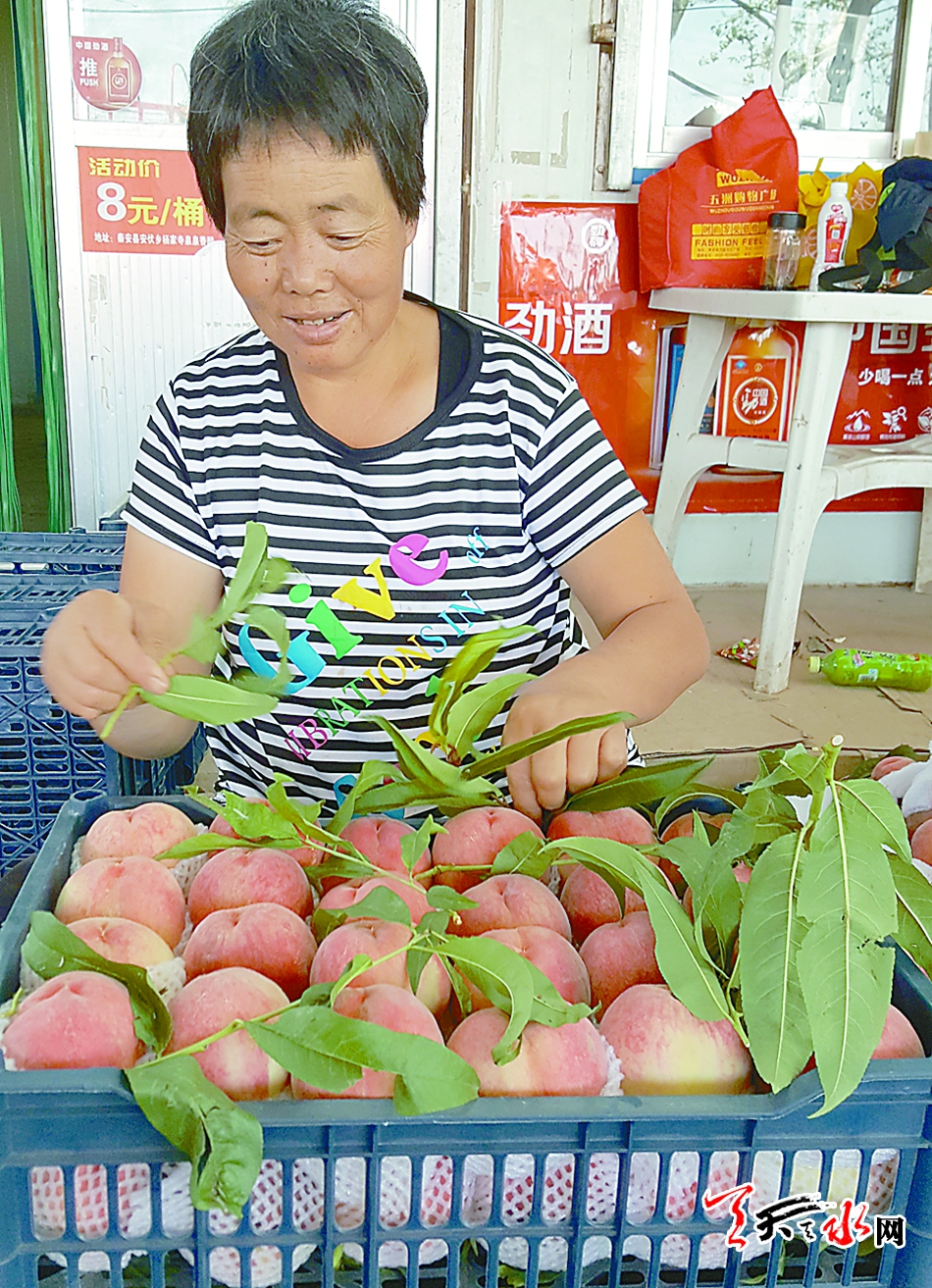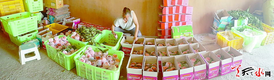 7月29日,记者来到秦安县刘坪乡万亩桃园看到,成熟的蜜桃挂满枝头,果农们忙着采摘。刘坪村一蜜桃收购点,大棚下几位农妇正忙着将刚采摘的蜜桃分检装箱,准备运往青海、宁夏等地。当问起今年蜜桃的收益情况时,她们乐呵呵地说:“今年的收成不错,能卖个好价钱。”一位来自青海的商客对记者说:“秦安蜜桃以个大、色艳、味美而声名在外,每年蜜桃成熟的时候,我都会来这里收购,然后销往全国各地。”