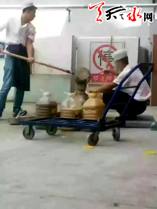 7月29日,记者朋友圈里的很多人都在转发着一条关于麦积区长途汽车站附近的“牛腩火锅”的工作人员在回收地沟油的消息。图片显示,两名穿着白色厨衣的人,将地沟里的发白物质挖出后盛在了食用油桶里。