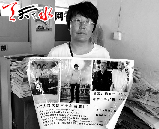 “父母年岁已高、体弱多病,在世的时日不多了,有生之年若不能看姐一眼,将是二老最大的遗憾,死也难闭眼。只要能找到她,让大人见一下,知道她过得好就行了。”8月10日下午,家住陇南市礼县永坪乡周家村的魏小芳,专程来到本报,希望借助媒体的力量寻找到自己失踪30年的大姐魏大妹,圆父母30年来想念女儿的梦。