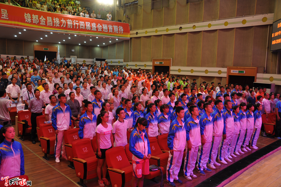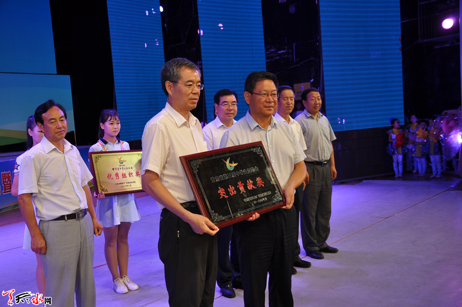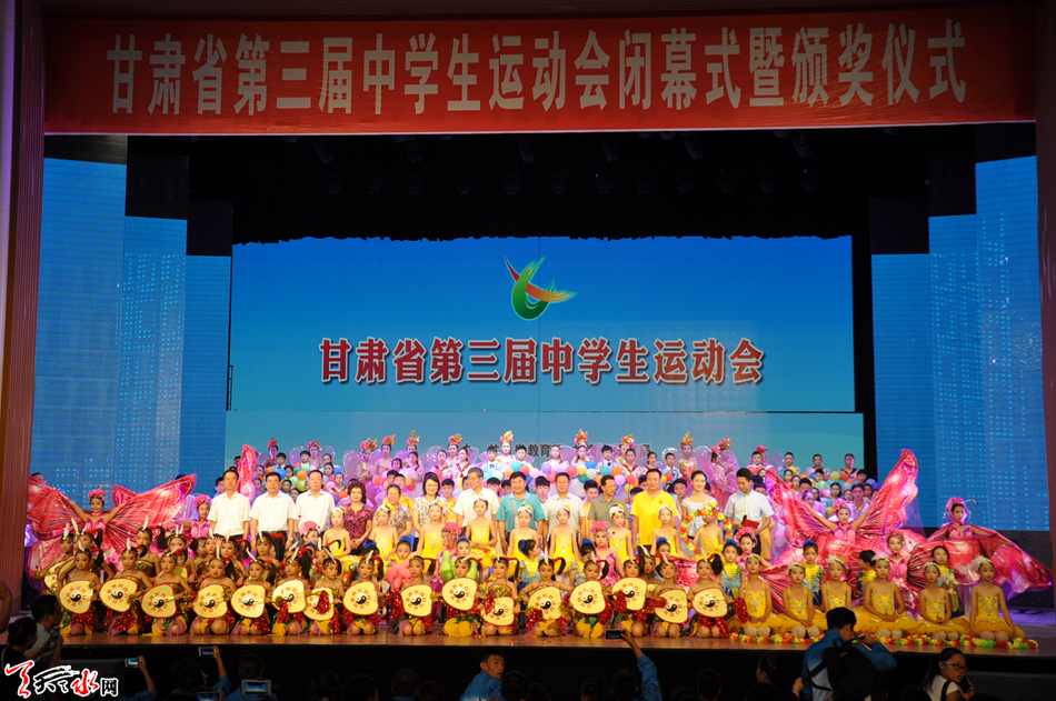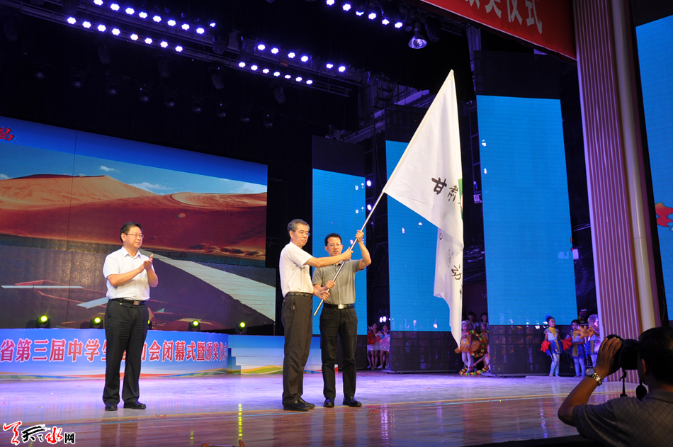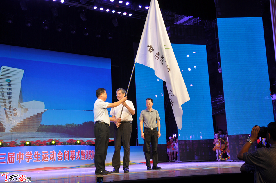 在闭幕式上,天水市副市长张建杰代表第三届中运会承办单位天水市政府向省中运会组委会圆满的交回中运会会旗。甘肃省政府副秘书长、省中运会组委会副主任俞建宁向甘肃省第四届中学生运动会承办单位金昌市授旗,金昌市政府副市长李剑萍代表第四届中运会承办单位接旗,这预示着全省体育的盛大赛事三年后将在金昌拉开帷幕。