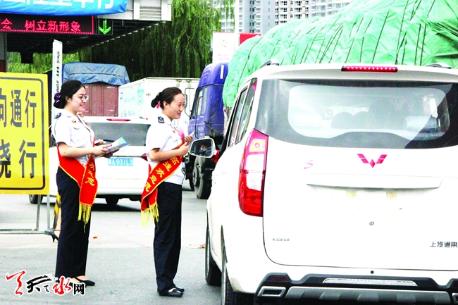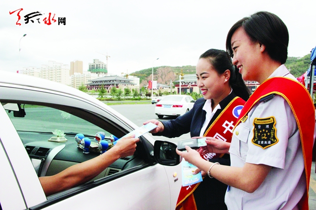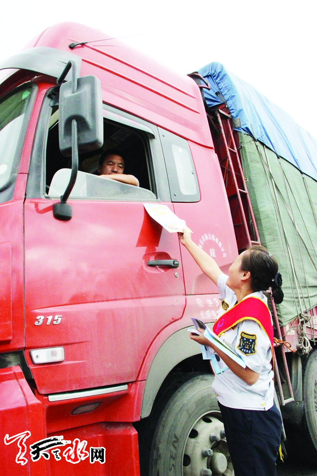 ▲天水高速公路管理处工作人员向过往车辆发放ETC宣传资料。