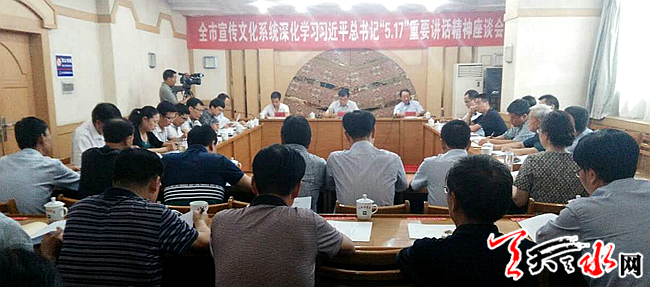 天天天水网讯【记者杨璟】8月31日,天水市宣传文化系统深化学习习近平总书记“5.17”重要讲话精神座谈会在天水迎宾馆召开。