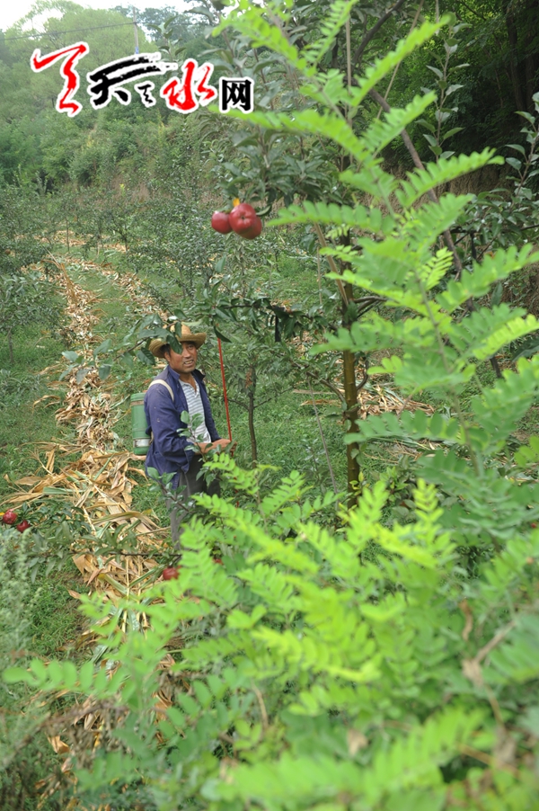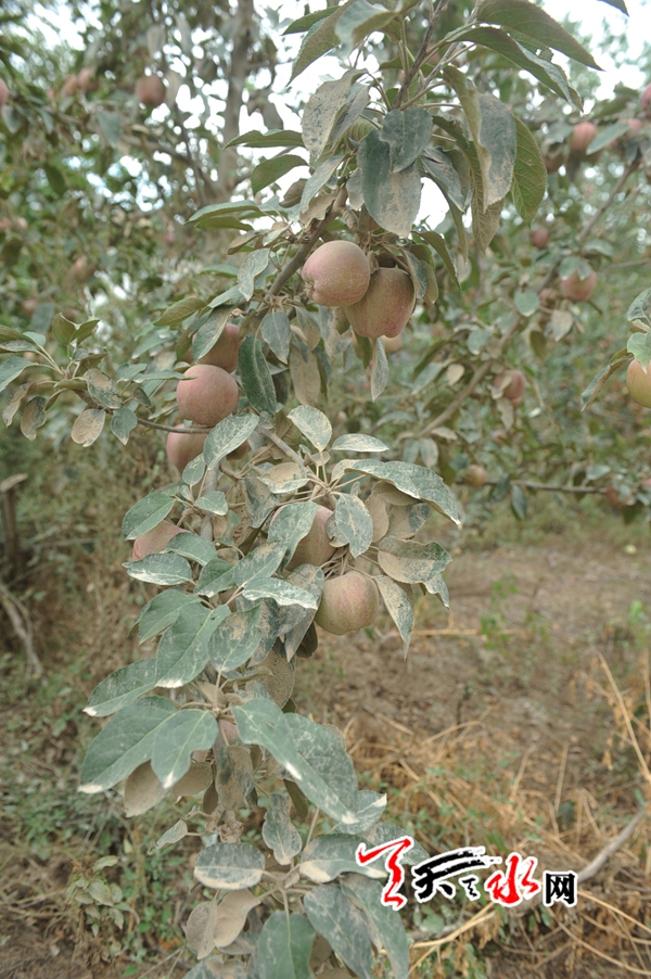 天天天水网1日18时讯 【记者 杨晓斌】9月1日,秦州区皂郊镇张家湾村,眼看着业已成熟的苹果变成了如此之色,一位农民发出了沉重的叹息之声,“今年的苹果又‘黄’了! 你看,红苹果都变成‘土’苹果了”。