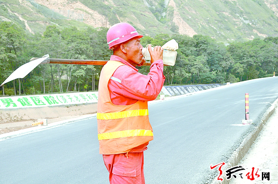 8月31日上午,记者在麦积区渭南镇麦甘公路的施工现场看到,一辆辆工程车、压路机正在紧张有序地在马路一侧进行施工作业,另一侧铺好柏油的马路已经有车辆过往通行。据施工现场一位负责人介绍,一侧修好再修另一侧,施工分批进行,现在进行的是铺垫水稳层的作业,待水稳层铺好,需要经压路机一遍遍碾压,然后进行压实度测量,达标后才能铺油。