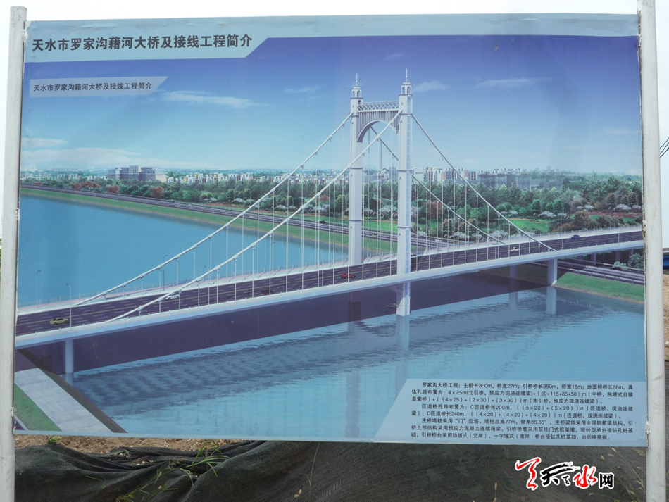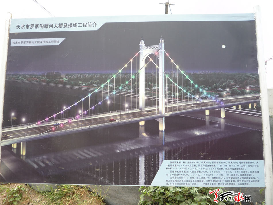 据介绍,罗家沟大桥工程位于规划经十路,自北向南,起点北山路,跨成纪大道、藉河、秦麦高速公路、罗家沟,终点位于羲皇大道,全长1.28公里,桥宽27米。大桥为独塔自锚式悬索桥,结构独特,利用主塔结构造型及高度形成一个独特的风景,整个结构比例协调,景观效果突出,是我市第一座大型悬索桥,概算总投资2.6亿元。