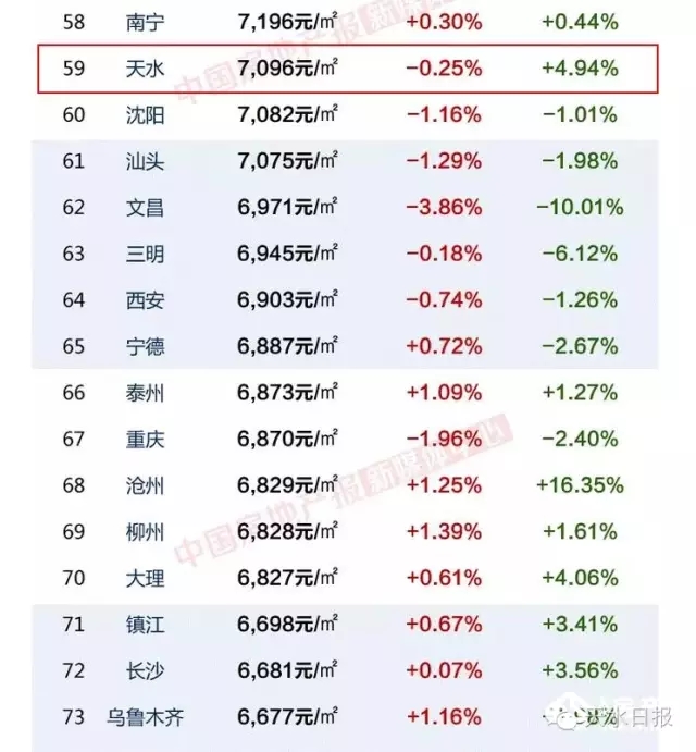 根据最新出炉的全国百城住宅均价显示,2016年8月,天水市商品住宅均价为7096元/㎡,环比下降-0.25%,同比上涨4.94%。虽然均价涨幅环比略有下降,但排名升高至全国百城第59位(7月份为61位),继续高出二线城市西安、重庆、乌鲁木齐等。(其中,2016年7月,天水均价7114元/㎡,环比上涨1.11%,同比涨2.86%;6月均价7035元/㎡,环比跌幅-0.22%,同比上涨+3.69%;五月均价7051元/㎡,环比+2.63%、同比+2.65%)