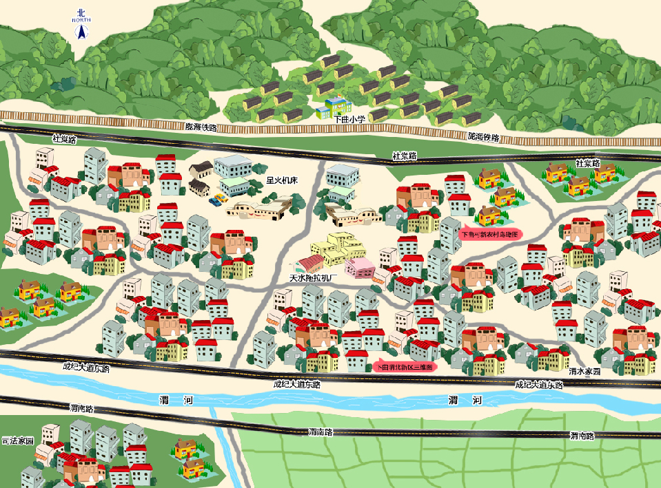 一张设计精美的卡通电子地图,呈现给观众的不仅是一张简单的方位图片,带给你惊喜的是这张立体卡通地图中有序地将秀美村庄缩略在其中,乡村道路指向,乡村建设布局,更有趣的是,乡村中主要景观和农家乐等将在这张卡通地图中以720VR三维动态全景图的新媒形态出现。