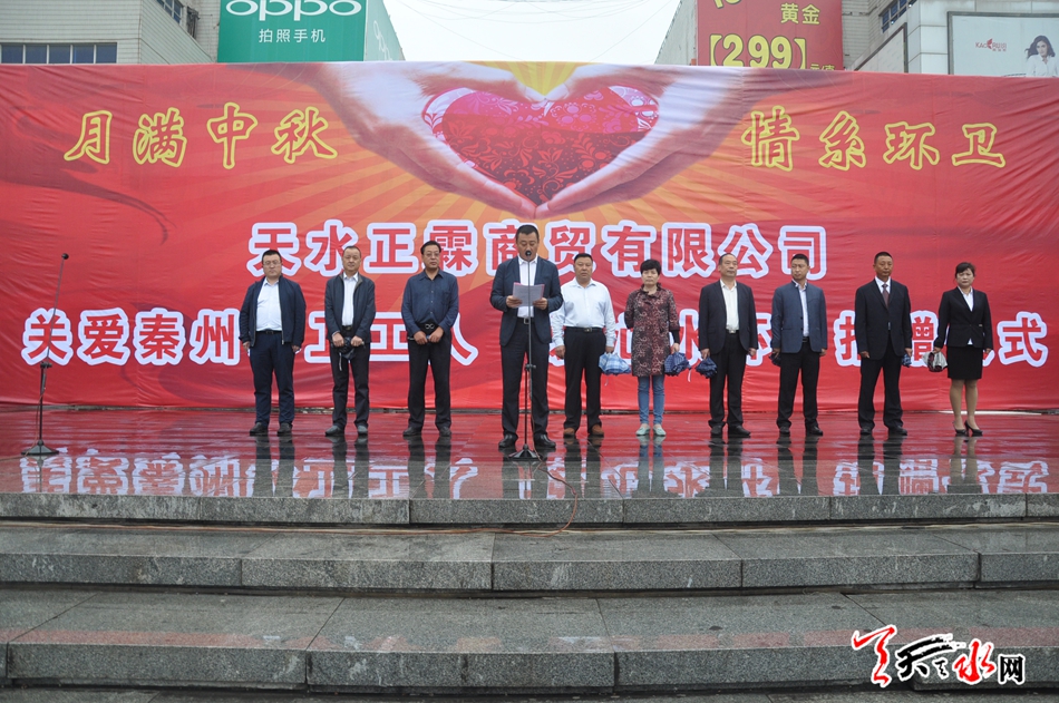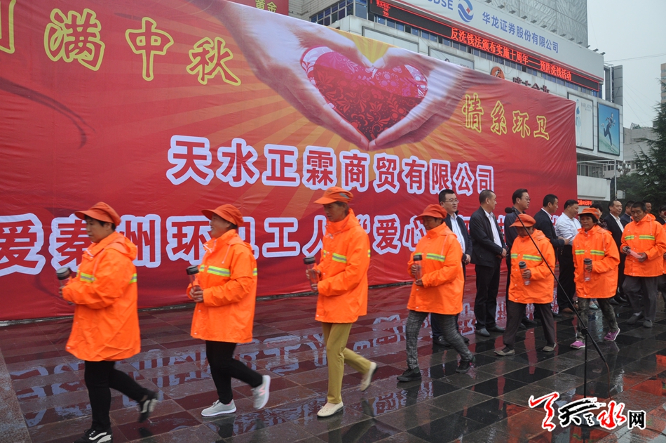 天天天水网14日10时讯【记者蔚军平】9月14日上午,秦州区在市龙城广场举行“月满中秋情系环卫”关爱环卫工人爱心水杯捐赠仪式,爱心企业天水正霖商贸有限公司为秦州区1400名环卫工人每人捐赠水杯一个,共计价值20万元。