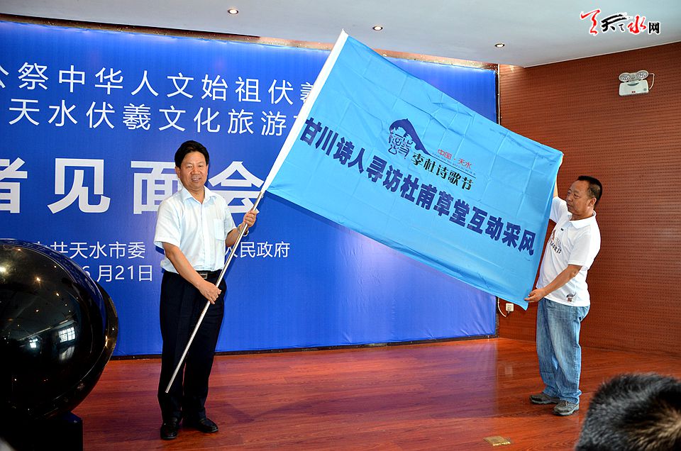 ▲6月21日下午,天水市委常委、副市长张明泰为甘川两省诗人互访成都杜甫草堂和天水东柯草堂互动采风活动授旗。