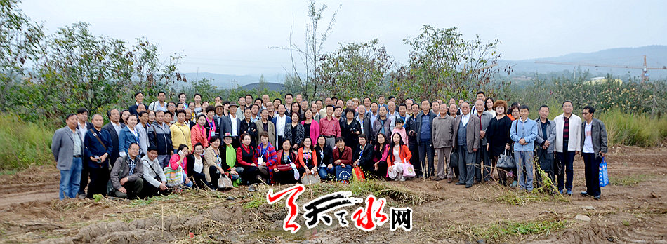 ▲与会人员实地考察白水涧并合影留念