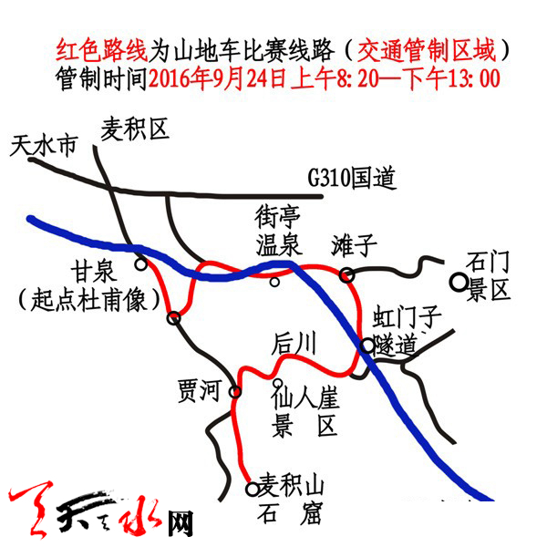 2016年“麦积山杯”全国山地自行车邀请赛将于9月24日(星期六)在麦积山风景名胜区举行。为保证比赛顺利进行,比赛当天需要对比赛线路进行限时交通管制。实行交通管制的路段(即比赛线路)从甘泉镇杜甫像路口(起点)出发,经元店至街子温泉,沿环形旅游线到达滩子,经虹门子隧道至后川、仙人崖,途径贾河到达麦积山山脚(终点),交通管制时间为2016年9月24日上午8:20—下午13:00。