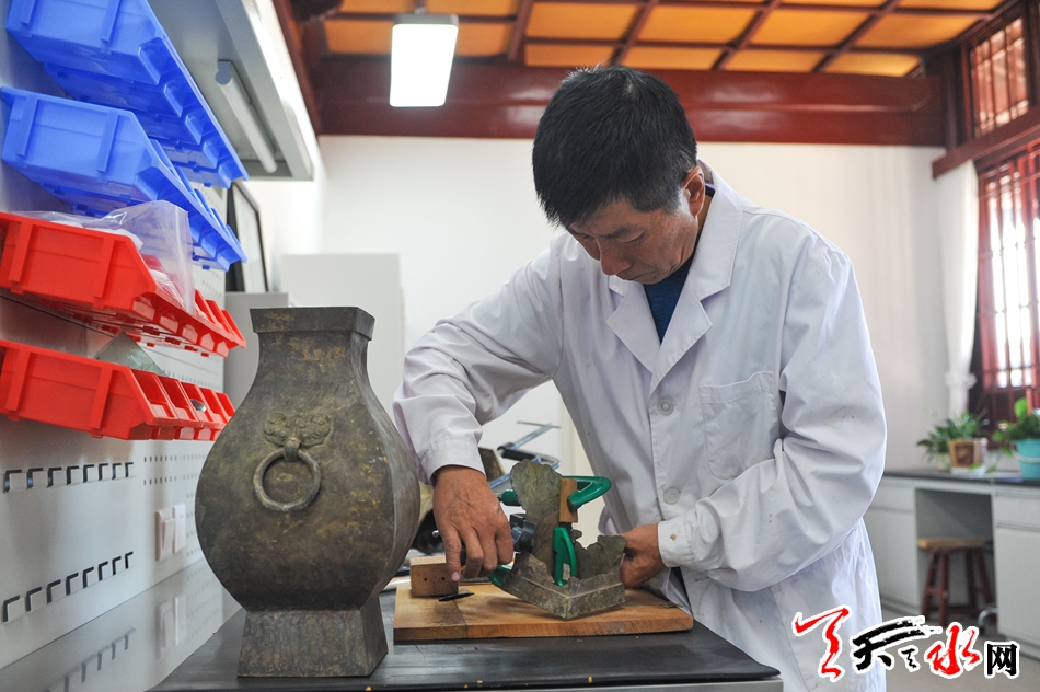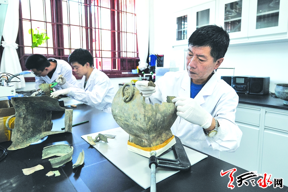 李小龙工作的院子,是天水市博物馆专门从事文物保护修复与科技研究的部门——文物保护修复中心。承担着本馆文物藏品保护修复任务的该中心,更像是一家整形医院,修复书画、铜器、陶器、贴金银铁器的技师,犹如外科医生,用回春妙手使一件件尘封地下,历经土壤侵蚀的破损文物重焕光辉,再盛于世。