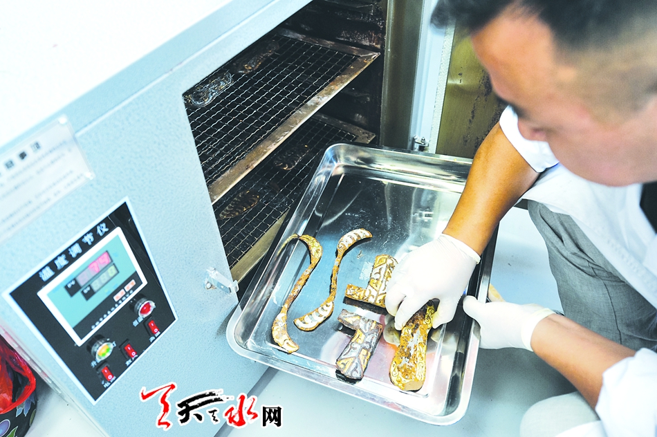 在烘干箱旁等了一个小时的文物修复师孟旭辉看看手表,认为“火候”已到,打开箱门,用钳子夹出烘干好的贴金银铁牌饰,进行进一步的修复。