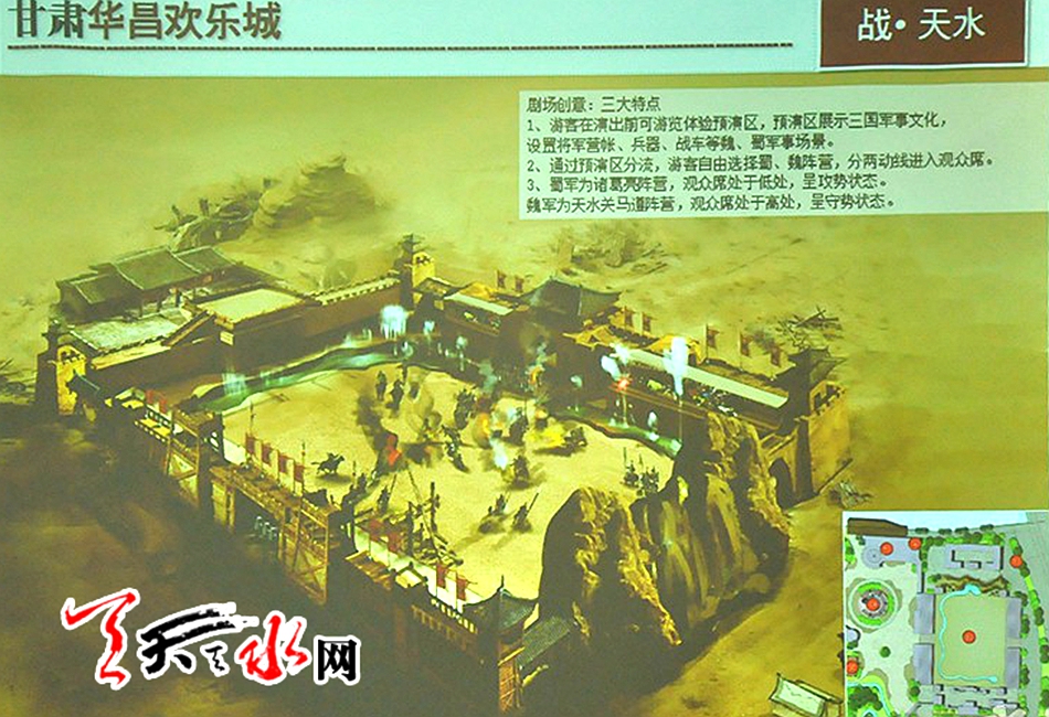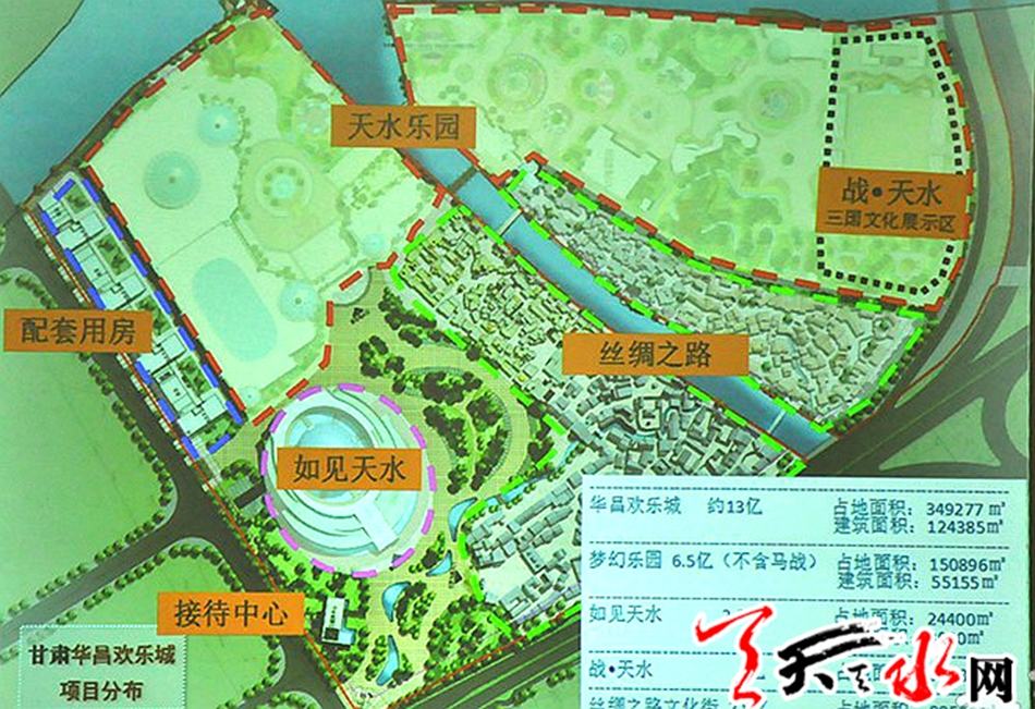 天水华昌欢乐城是市委、市政府积极响应国家“一带一路”发展战略,抢抓甘肃华夏文明传承创新区建设的良好机遇引进实施的重点文化旅游项目,总投资40亿元,占地1500亩,项目选址在麦积区甘泉镇宝天高速甘泉入口处区域。项目一期规划建设梦幻乐园、丝绸之路主题文化街、战·天水和如见天水等子项目,其中贯穿天水伏羲女娲文化、丝路文化、石窟文化、三国文化以及天水历史名人姜维、李广、苏惠等的传奇故事,力争充分挖掘和向外展示天水优美的自然环境、独特的人文景观和丰厚的文化旅游资源。