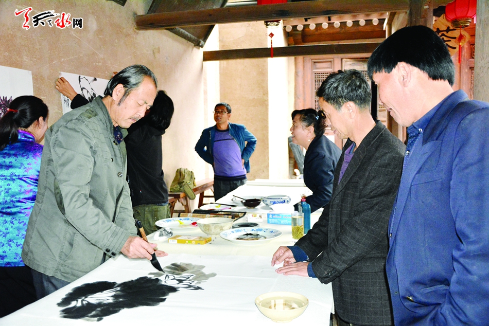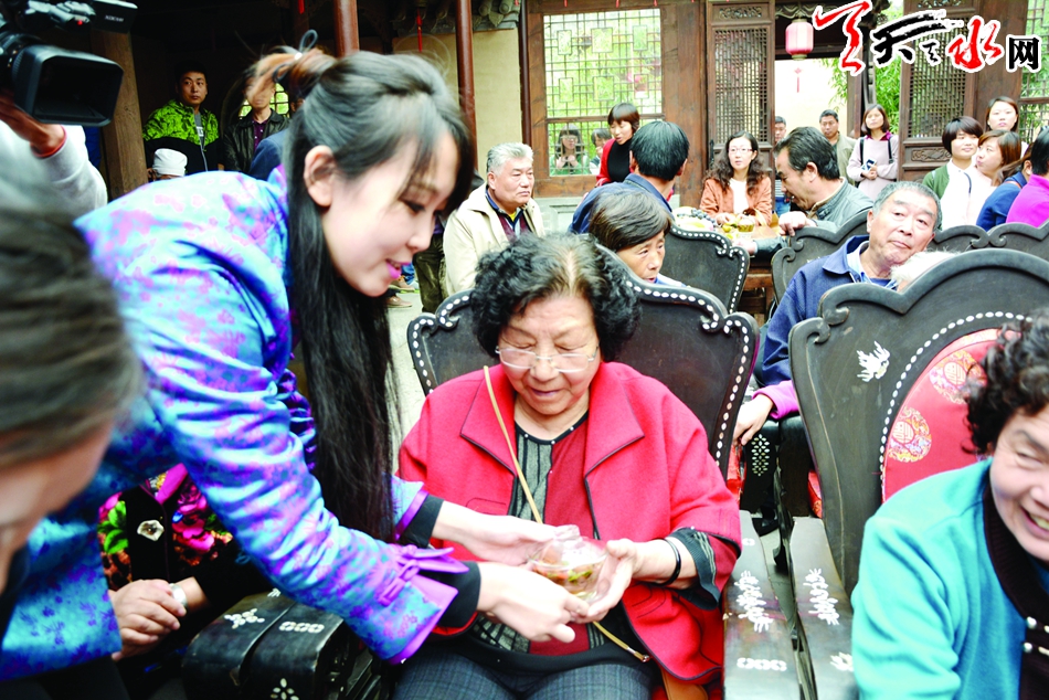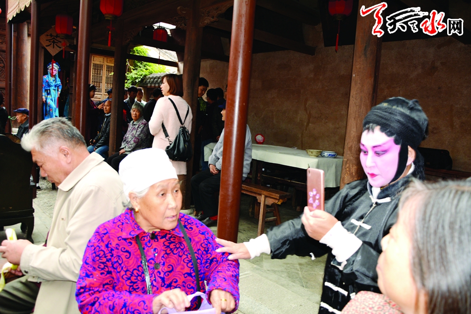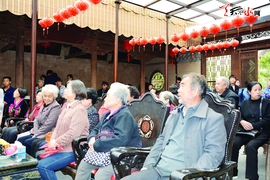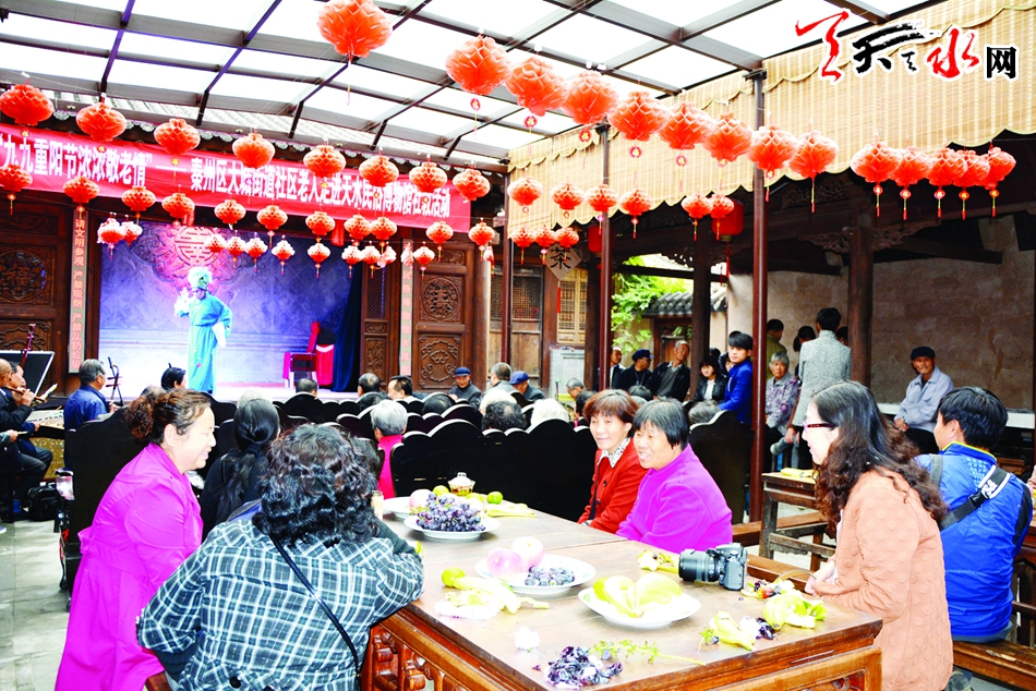 活动当日,老人们个个精神焕发,穿戴整齐来到南宅子,在讲解员的带领和细心讲解下,他们参观了民俗博物馆,并了解了这里的民俗文化。参观完后,老人们来到了戏楼,这里由该馆的工作人员早已准备好了丰盛的水果,他们津津乐道地观看了由天水民间秦腔艺术团表演的秦腔。老人们边看秦腔、边品尝由工作人员为他们敬的茶水和水果。在观看表演的过程中,老人们有的轻声吟唱,有的跟着演员的表演敲打着节拍,有的干脆趁空隙直接上台清唱几嗓子。从老人们的表情不难看出,当日的活动,让他们过了一个如此开心快乐的节日。活动结束后,由天水市楹联协会的书画爱好者为他们赠送了现场创作的书画作品。