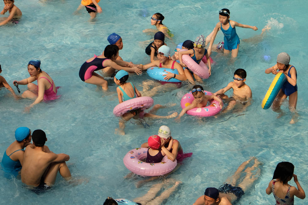 据《大西洋月刊》报道,澳大利亚摄影师费边-缪尔(Fabian Muir )在过去两年来曾五次走访朝鲜,从首都平壤到景色秀丽的乡间田野,缪尔用相机记录下了朝鲜民间生活的真实景象。在缪尔的镜头下,这座世人眼中神秘又压抑的国度似乎多了些鲜活明亮。图为孩子们在平壤的公共泳池中嬉戏玩耍。