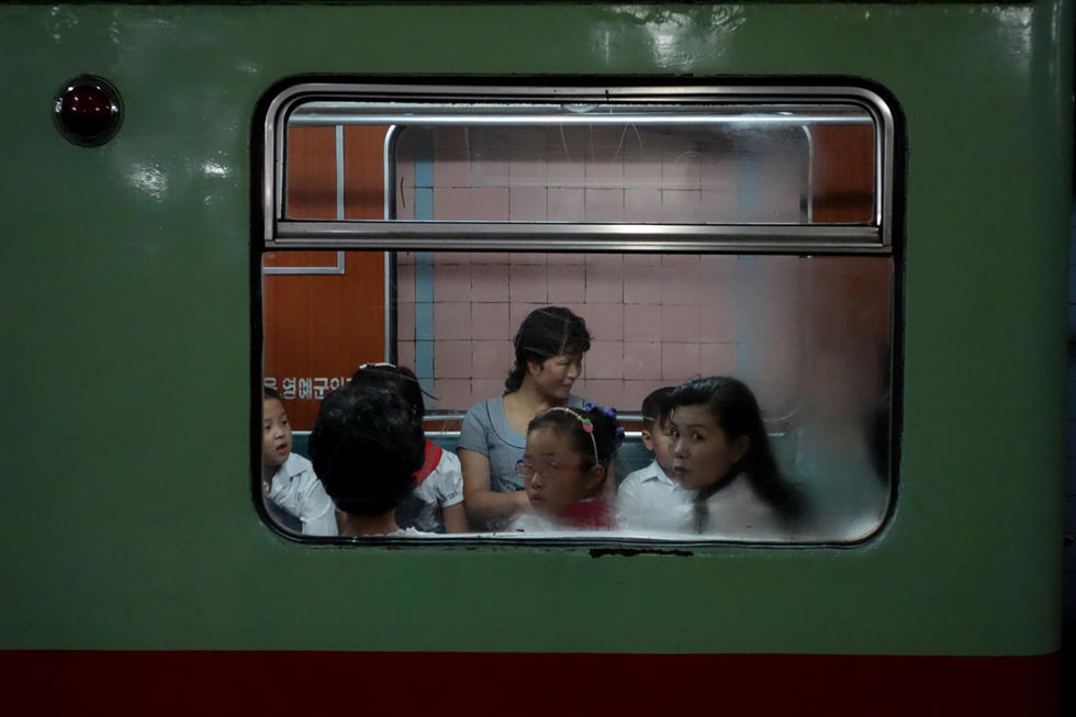 朝鲜地铁一瞥,乘客们透过窗口看着正在拍照的摄影师缪尔。