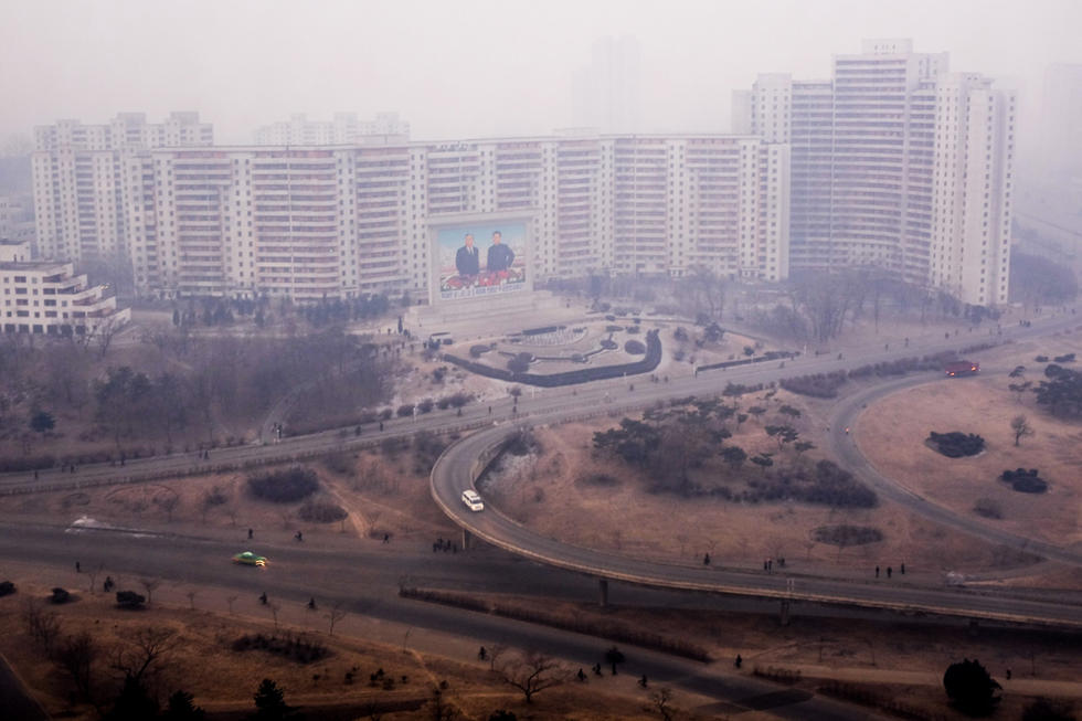 冬季的晨雾笼罩着平壤一座座公寓楼。