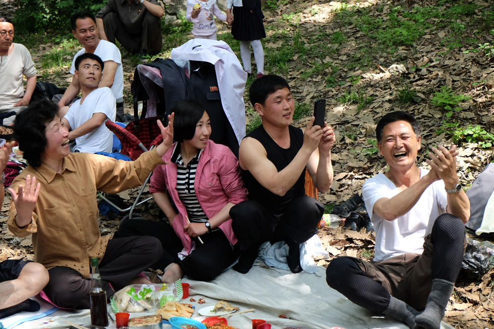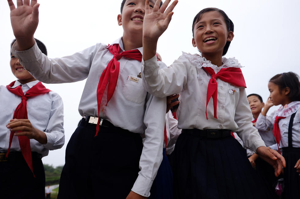 在朝鲜第二大城市咸兴,带着红领巾的孩子们在外郊游,他们朝着同伴招手,脸上挂满笑容。