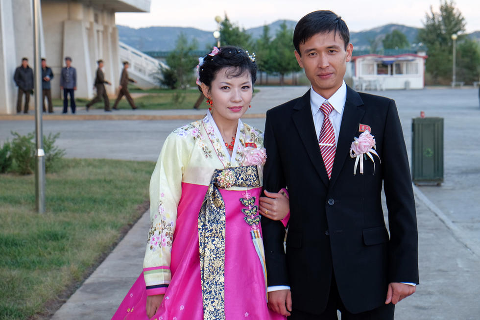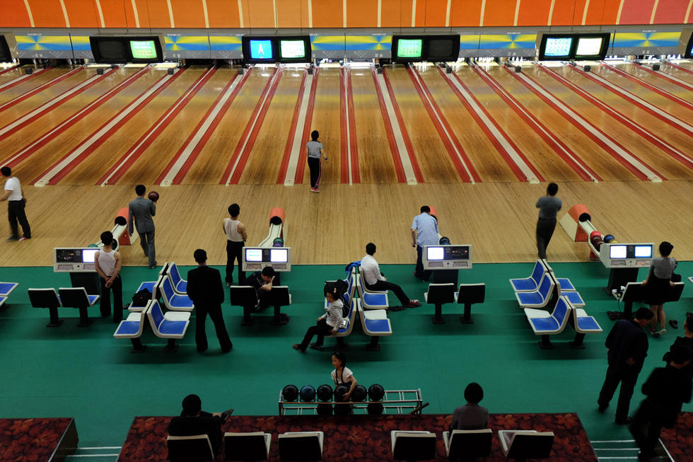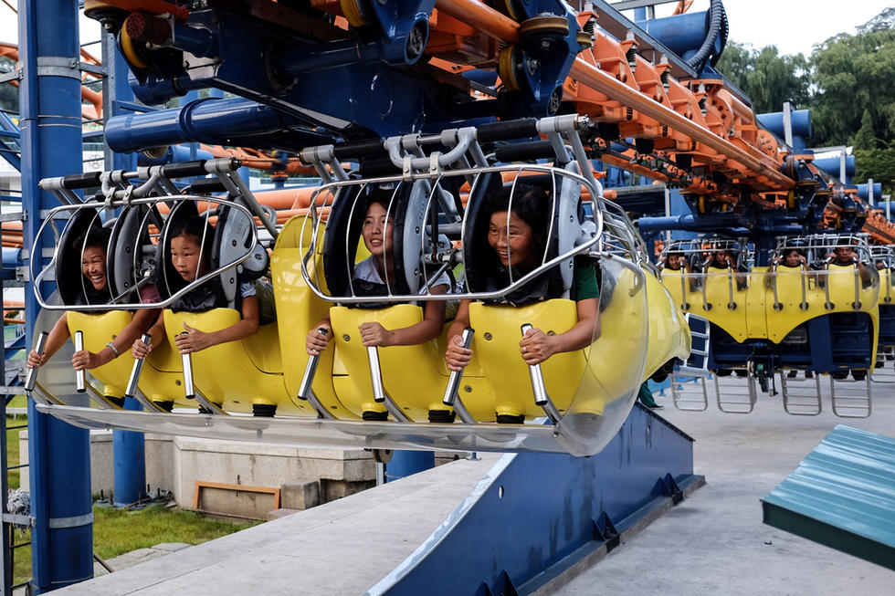 朝鲜凯旋青年公园,年轻的姑娘们兴奋地等待过山车启动。在朝鲜清津,服务员在停电时拿出应急灯为用餐的顾客照明