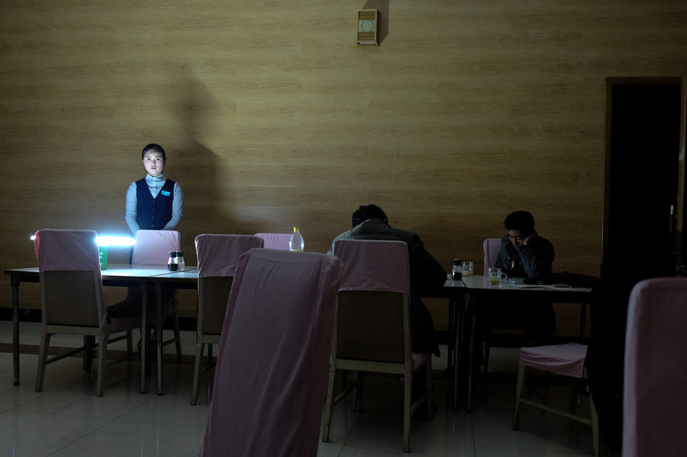在朝鲜清津,服务员在停电时拿出应急灯为用餐的顾客照明