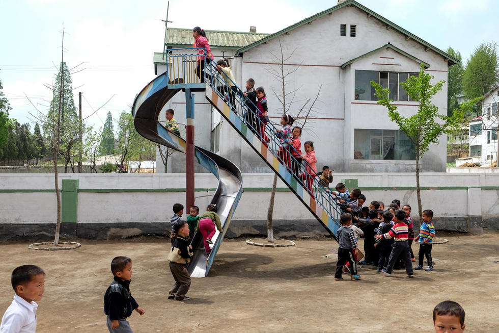 朝鲜农村,孩子们在学校的操场上排队玩儿螺旋滑梯。