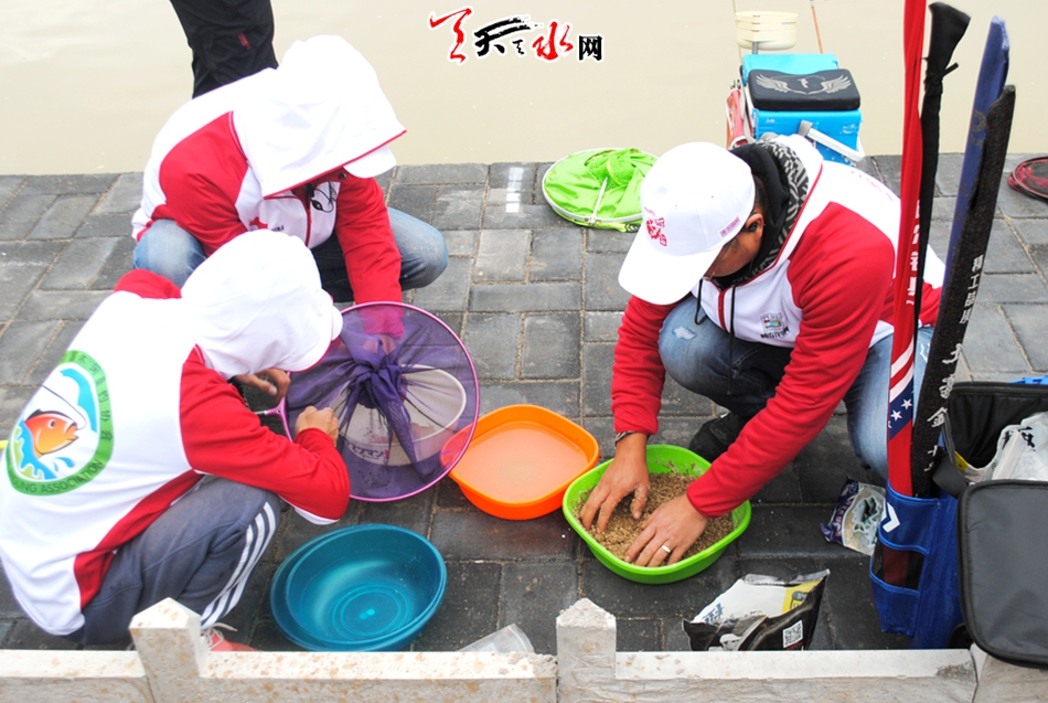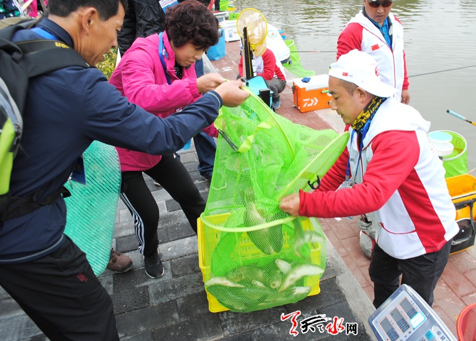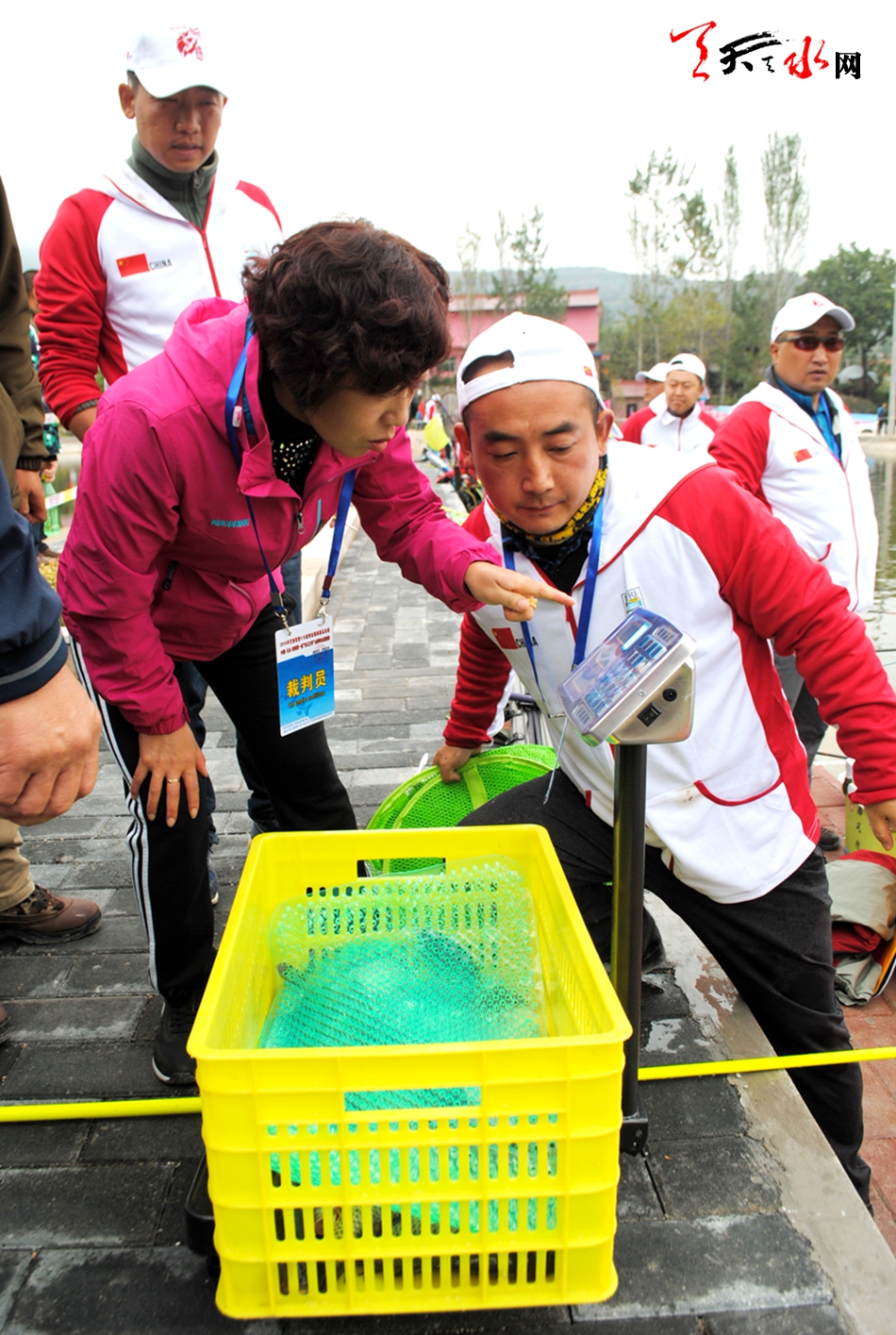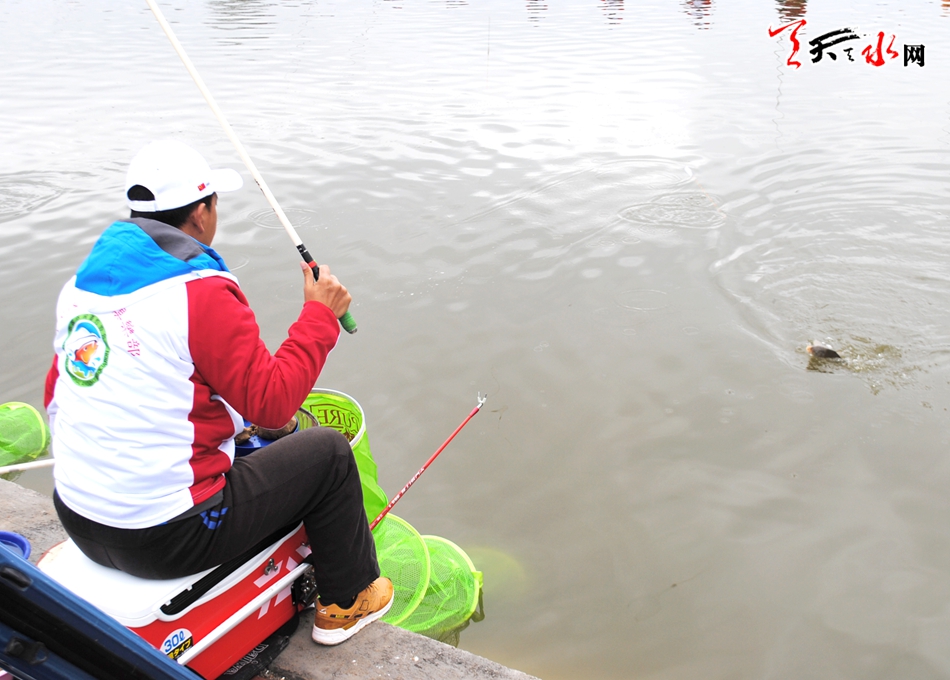 在当天上午的比赛中,来自全国各地的钓鱼选手们分别排列在鱼池两边,只见一尾尾鱼儿相继上钩,挣扎着被拖出水面。