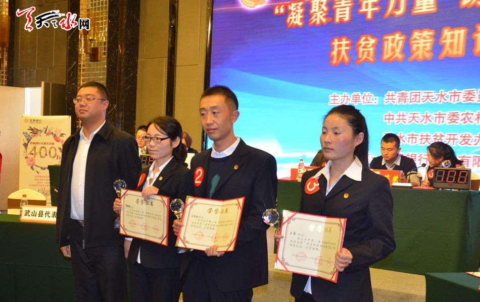 此次扶贫政策知识竞赛由团市委、市委农工部、市扶贫办主办。参赛队包括秦州区代表队、麦积区代表队、秦安县代表队、甘谷县代表队、武山县代表队、清水县代表队、张家川县代表队七支代表队。比赛分必答题、抢答题、风险题三个环节进行。经过激烈角逐,武山县代表队获得一等奖,秦安县代表队获得二等奖,麦积区代表队和清水县代表队获得三等奖,秦州区代表队和甘谷县代表队获得优秀奖。