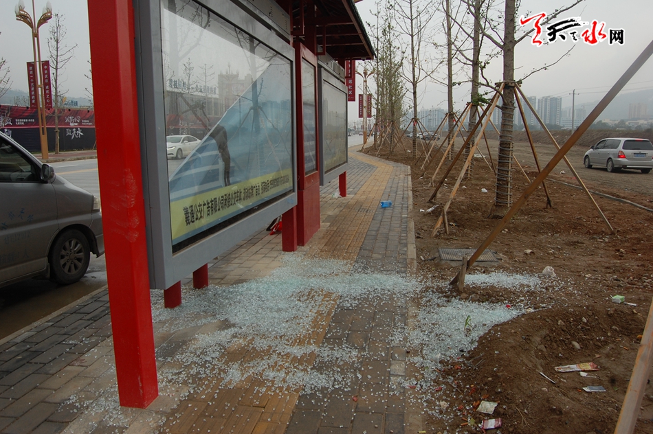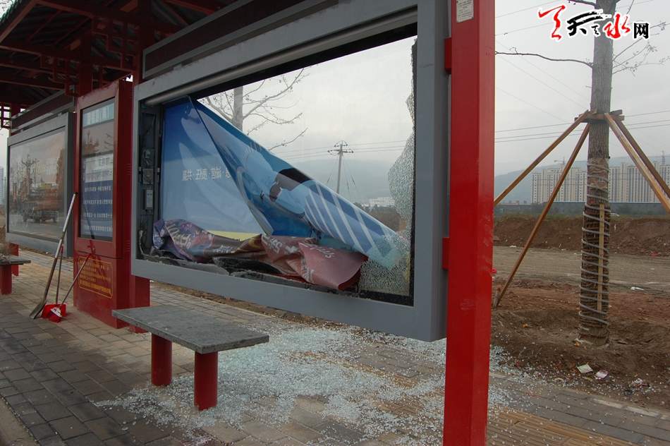 “仅9月17日一个晚上,成纪大道两个智能公交站亭橱窗就有5大1小6块玻璃被破坏,国庆节前后,这条路段又有几个站亭的橱窗玻璃被损坏。这不,今天又接到反映说该路碧桂园(南)公交站亭的橱窗玻璃也被破坏了。”10月12日,一听到记者采访公交站亭遭破坏的情况,负责我市公交站亭维护工作的天水羲通公交广告有限公司负责人张经理便气愤地说。