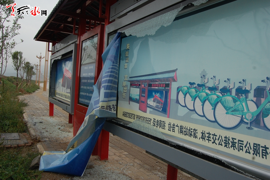 在成纪大道上,这样的情况似乎十分普遍。记者从碧桂园(南)站开始,沿成纪大道一路向东实地探访,相继在闫家河湾村(南)、天水商贸城东站、峡口西站、峡口中站、峡口东站公交站亭发现有橱窗玻璃受损的情况,初步统计了一下,各站亭被砸坏的橱窗玻璃竟达15块之多,在破碎一地的玻璃碴中不乏石块、砖头的身影,其中尤以峡口中站两对面的公交站亭破坏最为严重,站亭橱窗玻璃全军覆没后已成“透视窗”,而橱窗内的电路线缆也难幸免于难。
