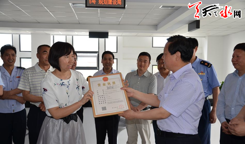 ▲资料图:2015年6月1日,天水市委副书记、市长杨维俊颁发全市首份”三证合一“营业执照。