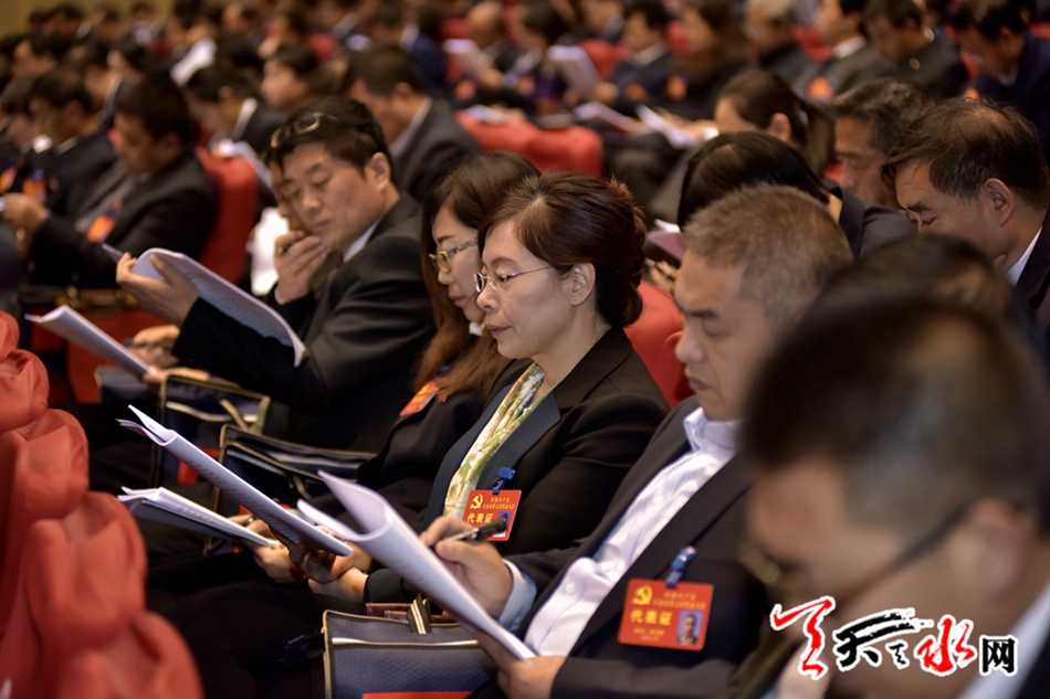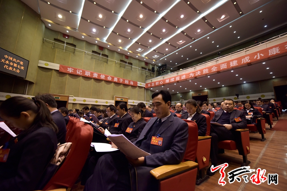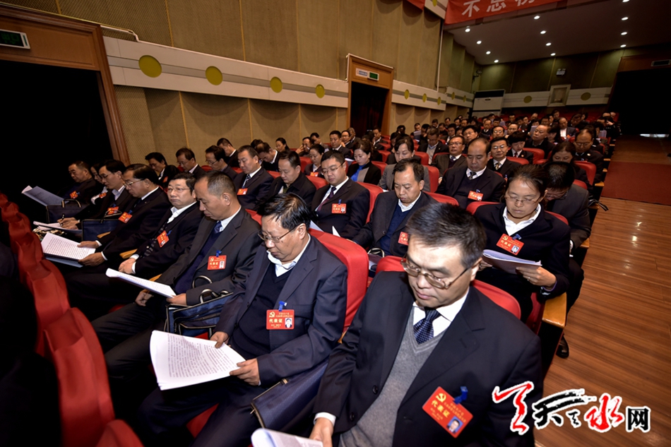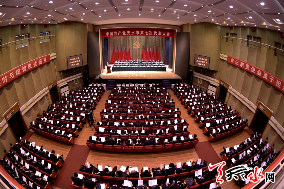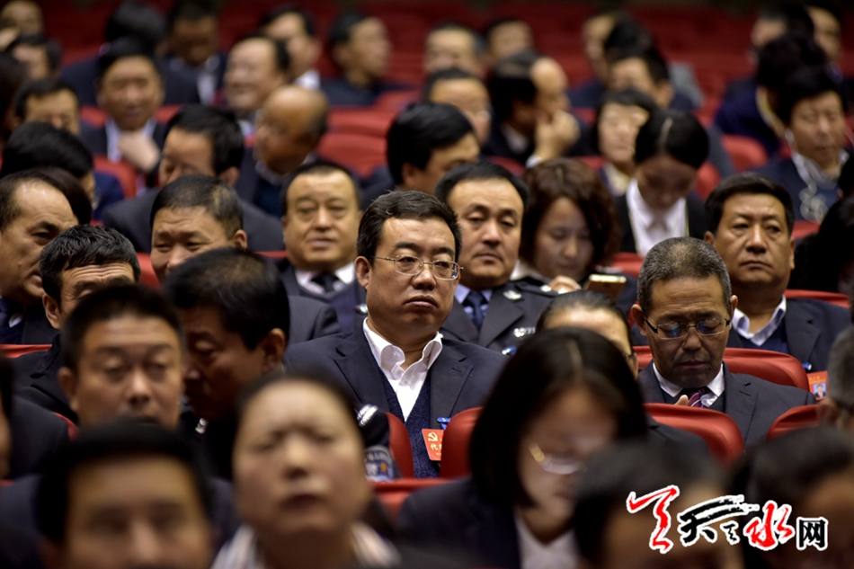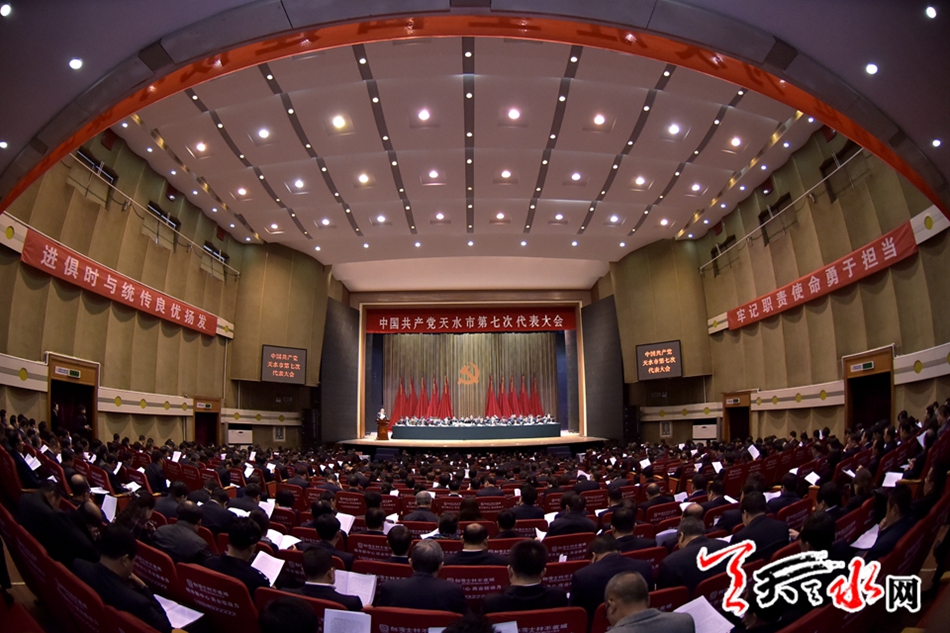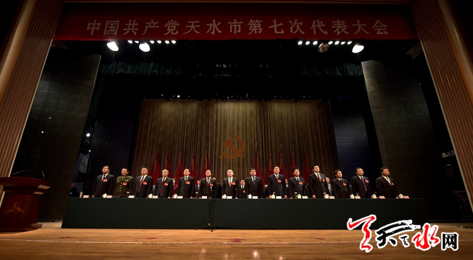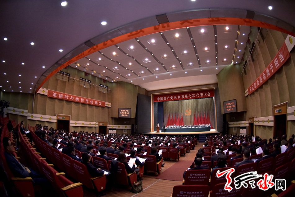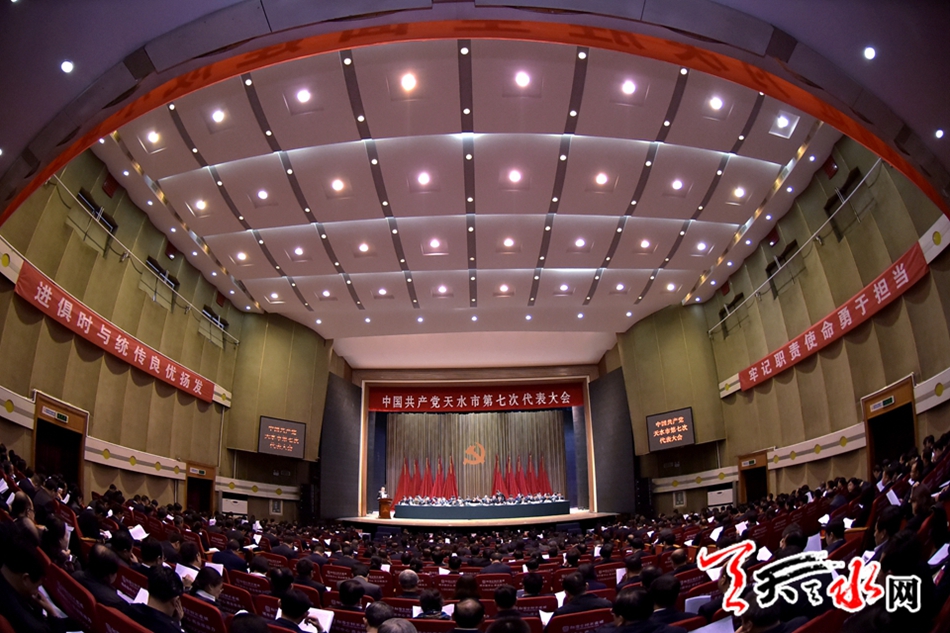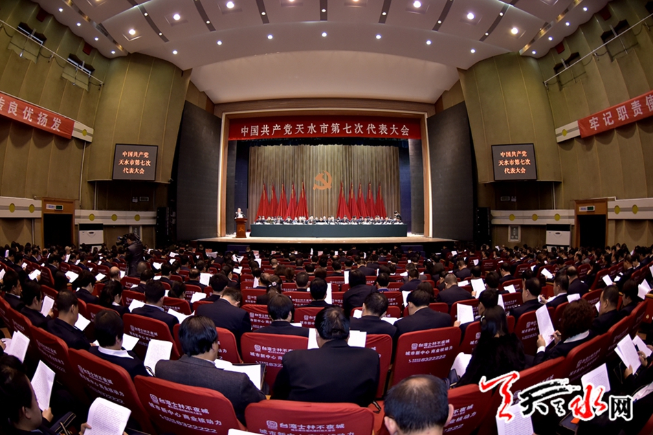 当日上午的秦州剧院庄严隆重,喜庆热烈。大会主席台上方悬挂着“中国共产党天水市第七次代表大会”的会标,帷幕中央金色的党徽光彩夺目,十面鲜艳的红旗分列两侧。