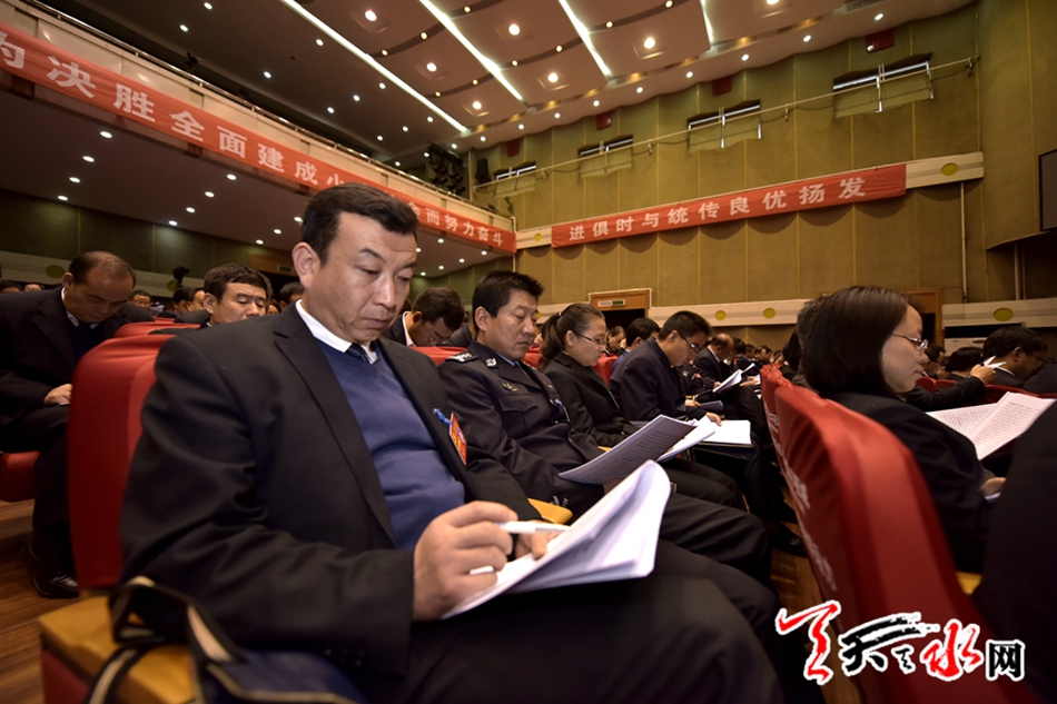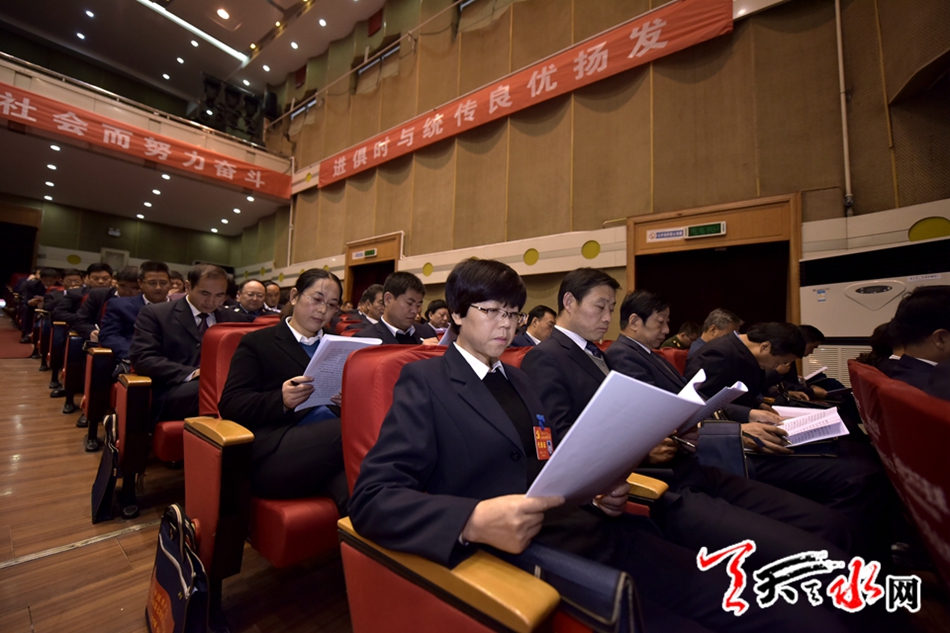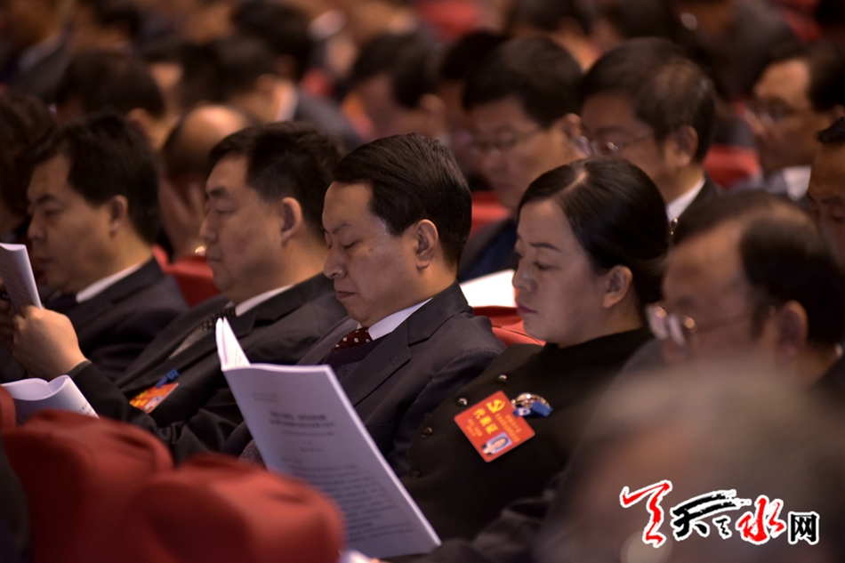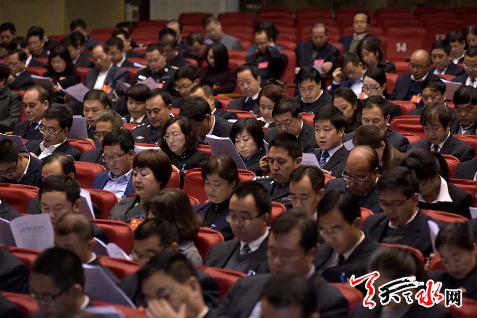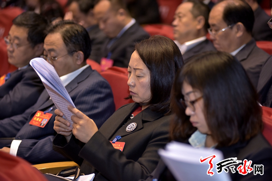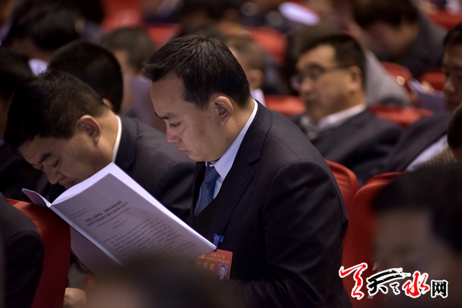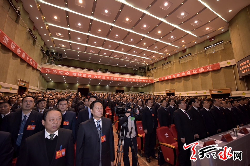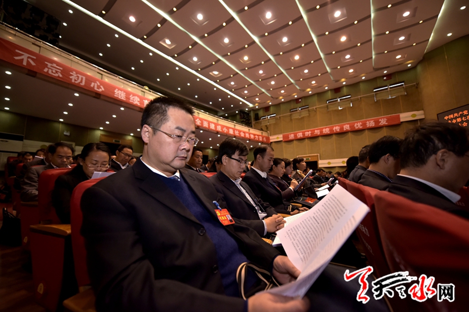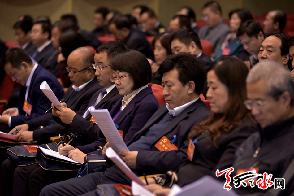 当日上午的秦州剧院庄严隆重,喜庆热烈。大会主席台上方悬挂着“中国共产党天水市第七次代表大会”的会标,帷幕中央金色的党徽光彩夺目,十面鲜艳的红旗分列两侧。
