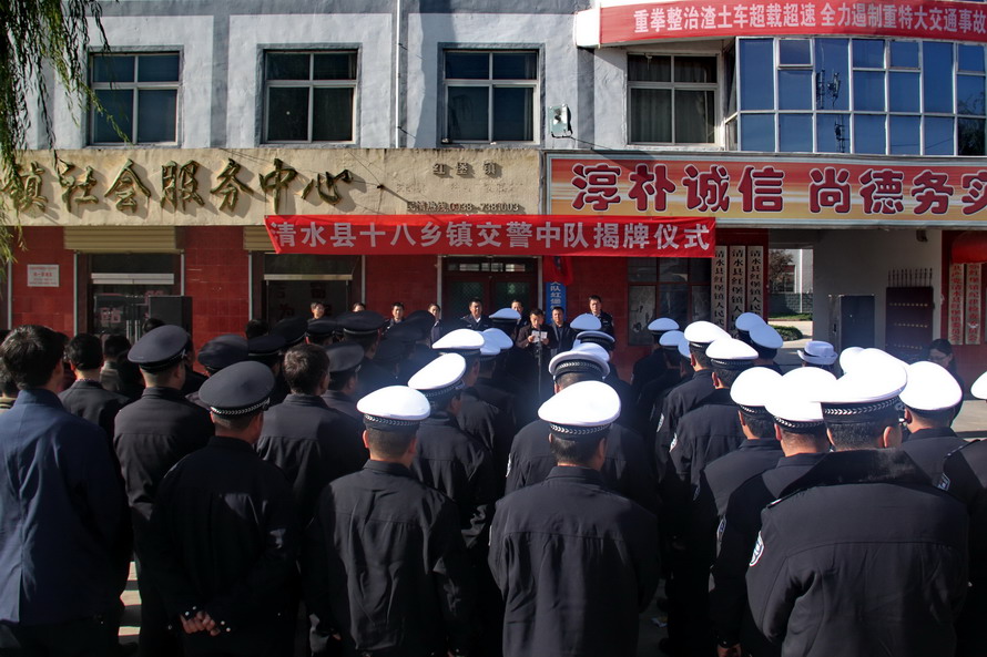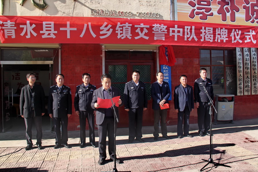 天天天水网讯 11月2日下午,清水县举行18乡镇交警中队揭牌仪式。市公安局交警支队副政委黄泰生,县委常委、常务副县长牛永祯,县委常委、政法委书记秦永斌出席揭牌仪式。18乡镇乡镇长、交管站长、交警中队全体人员,以及县公安局、安监局主要负责人,共计90余人参加了揭牌仪式。