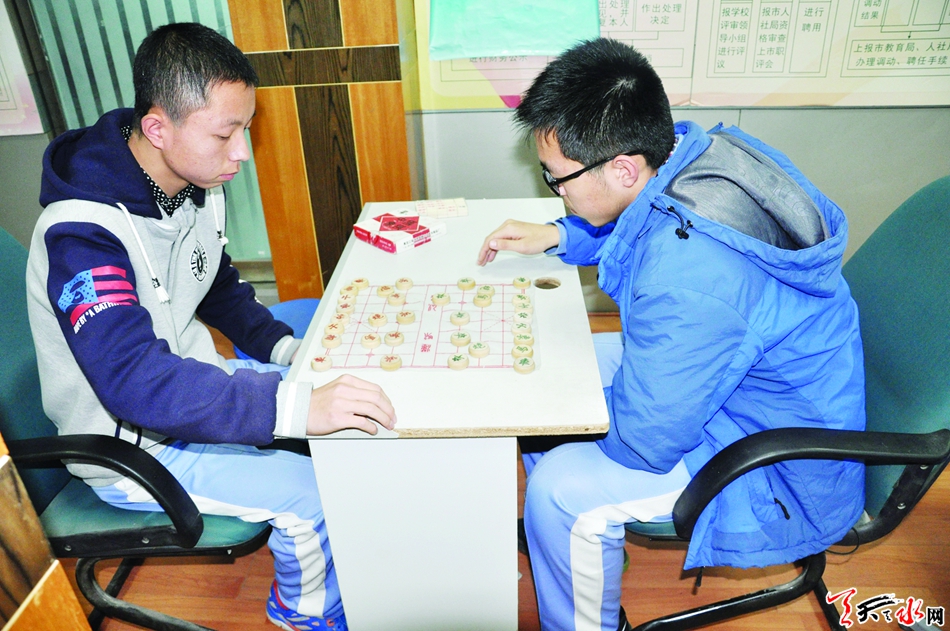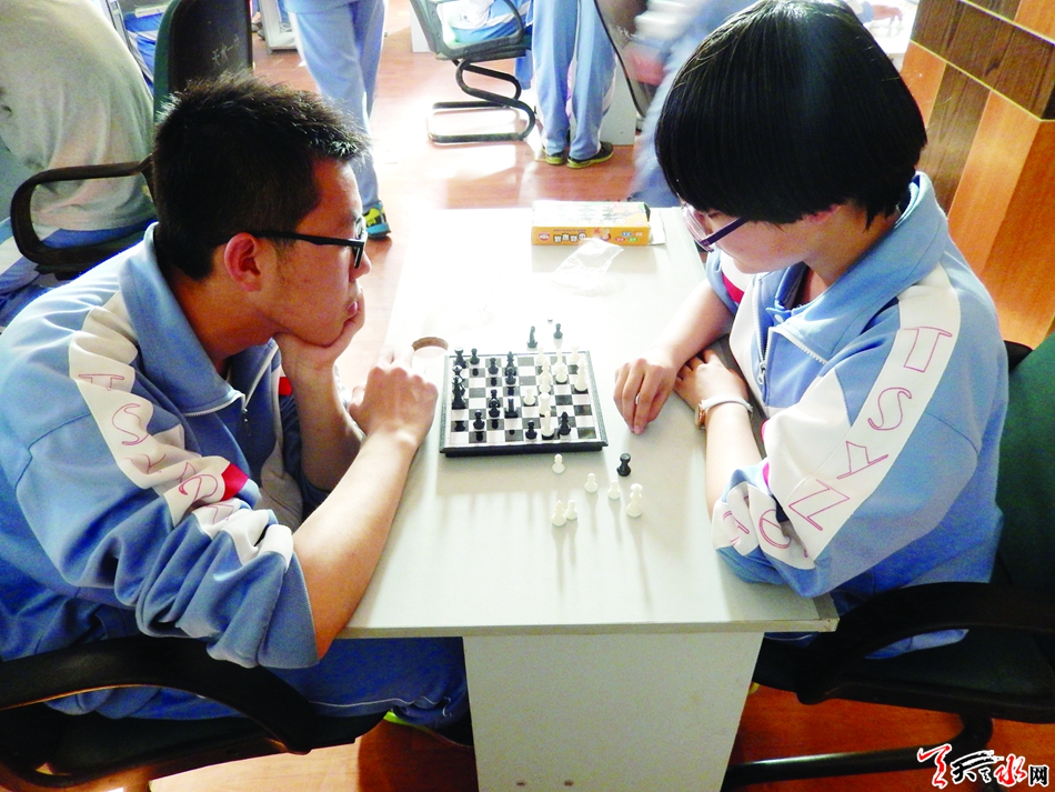 记者跟随黄书记来到各个社团参观,发现每一位学生都热情高涨,棋艺社内,双方正在紧张地“对战”,一场耐心与智慧的较量在小小的棋盘上展开;合唱社内,身着统一校服的学生们站在阶梯教室内的讲台上,在老师的指挥下整齐地高歌着,抒发着心中的理想与热情……这里,没有了紧张压抑的氛围,教学楼内变成了另外一番景象。