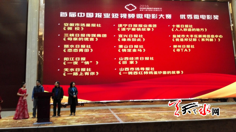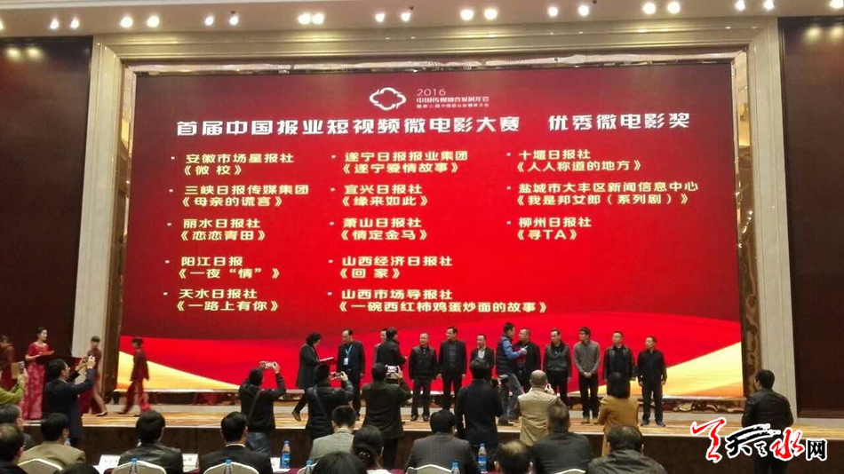 天天天水网吴江讯【记者姚宇】11月10日晚,首届中国报业短视频微电影大赛颁奖典礼如期在苏州市吴江宾馆举行。会议对中国报业短视频微电影大赛优秀微电影优秀短视频作品进行了展演并表彰,天天天水网拍摄选送的微电影《一路上有你》荣获优秀微电影奖。