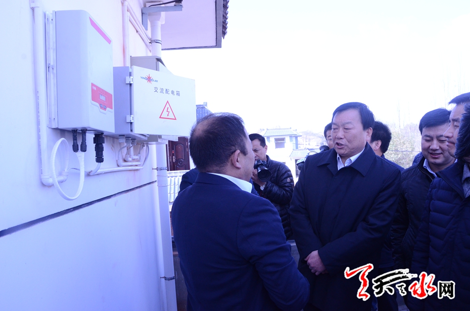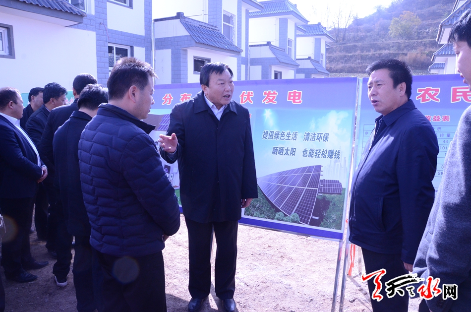 在异地搬迁的住户屋顶安装20平米的太阳能发电装置,不仅可以完全满足住户生活用电需求,多余的电量还可以卖给国家电网,每年可为贫困户增加纯收入1500元,这不是梦,也不是传说,而是秦岭乡关砚村异地扶贫搬迁的新创举。在这个示范点上,天水市市委书记、秦州区委书记雷鸣显示出极大关注,他特意指示太阳能示范项目负责人详细的向工作组介绍了项目的细节,并嘱咐该负责人说:“你这个项目很好,一举两得啊!抓紧实施,进一步结合建筑实际,生产符合这里房子实际样式的太阳能板,达到既实用又美观的目的,同时希望通过你能把生产厂家引进来,扎根我们天水,为天水的新能源开发与应用做一些贡献。”随后,雷书记走进一户新居,详细的查看了太阳能供暖装置,弯腰用手背测试已经安装就位的地暖的温度,登上楼顶查看了太阳能发电的输送电配套设备安装和运行情况。