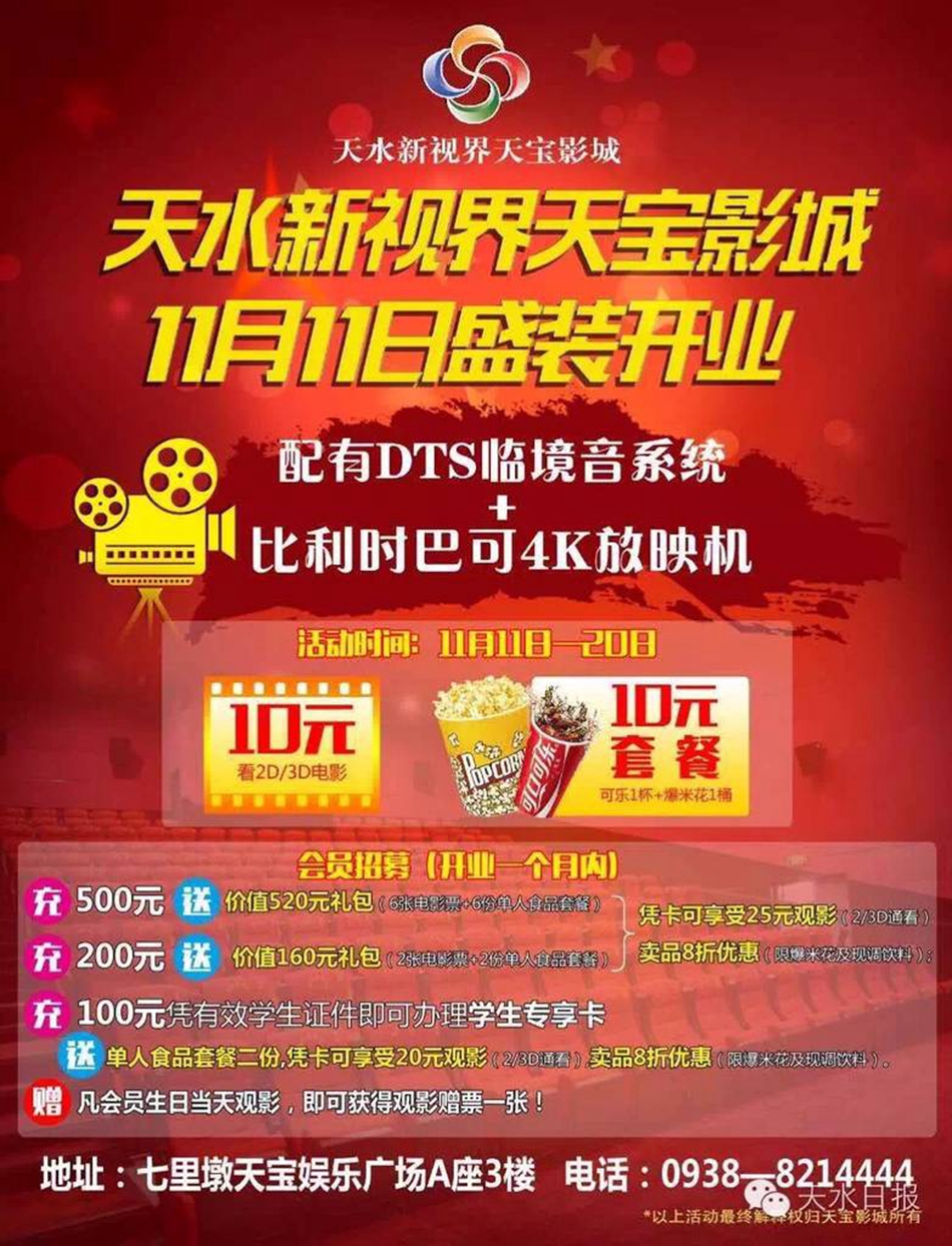 天宝影城是甘肃全省首家配备国际顶级电影专业放映设备---比利时巴克4K数字放映机的影城。4K放映机的清晰度是目前国内主流2K放映机的4倍。4K放映系统会使画面非常清晰、透彻,连人物表情的细小部分也细致展现,电影中的烟雾、尘土等具有透色效果的画面,在4K画面中也非常准确,不会丢掉任何色彩和景物细节,能使观众欣赏到触手可及更加逼真、更具感染力和震撼力的画面, 感受无与伦比的视听盛宴。